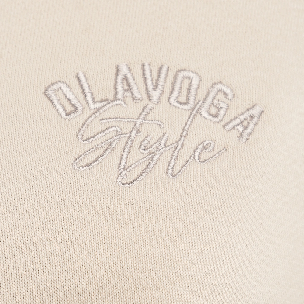 Delikatnie oversiz’owa bluza, o krótszym kroju. Wykonana z wysokiej jakości bawełnianego materiału. Na brzegach prążkowane ściągacze. Przód posiada minimalistyczny haft z logo marki OLAVOGA z pisanym haftem STYLE. Na jednym z rękawów obszerne logo brandu.