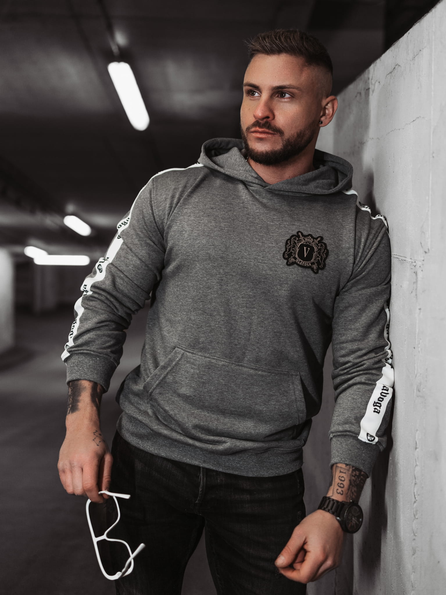 Sportowa bluza z kapturem, klasyczny krój kangurki. Na brzegach prążkowane ściągacze. Obszerna kieszeń. Na rękawach lampasy z ozdobnym haftem OLAVOGA. Z przodu znajduje się ciekawy haft.