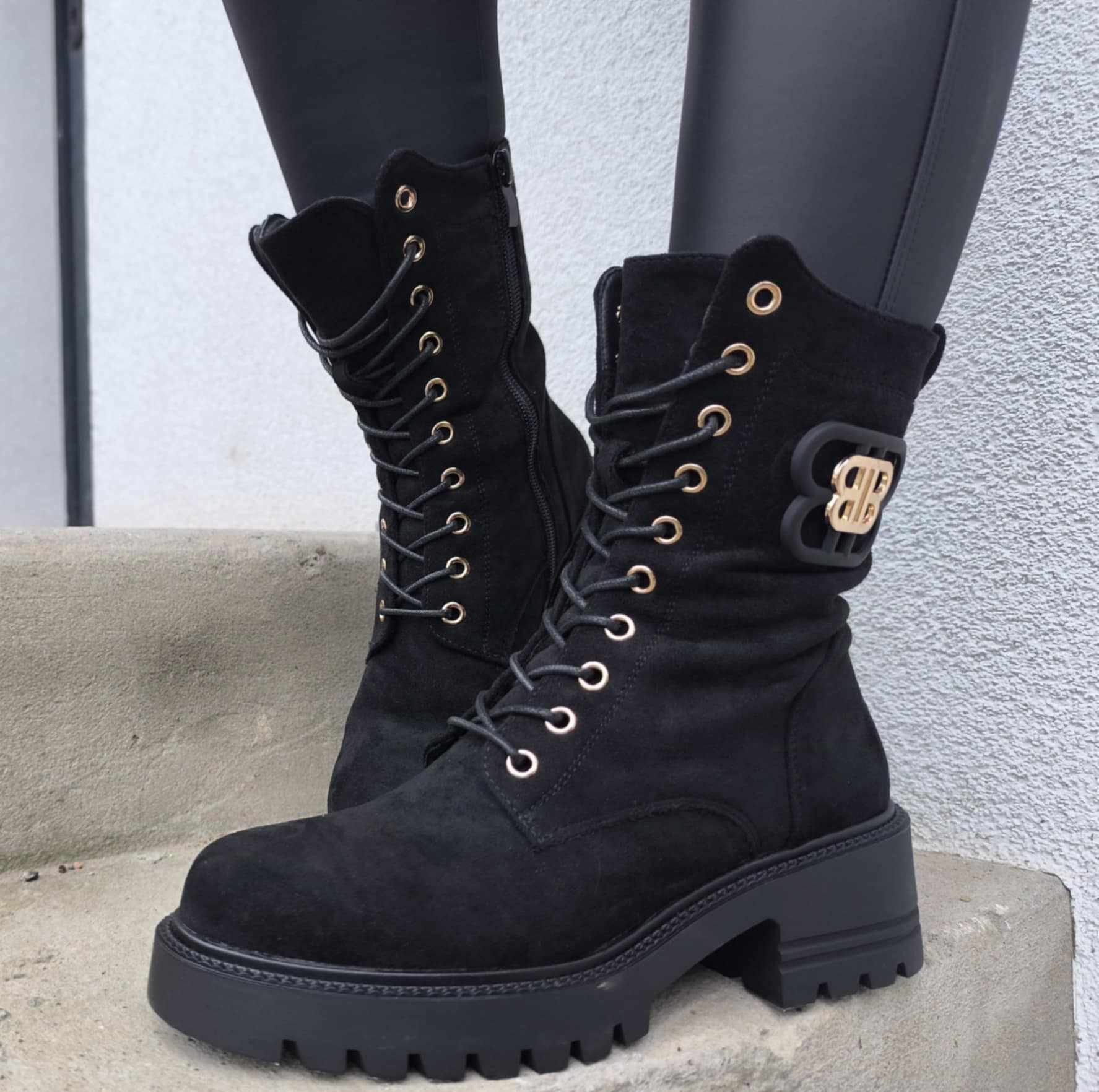 Stylowe, czarne botki sznurowane na grubej podeszwie, znane również jako workery, to idealny wybór dla kobiet ceniących modny wygląd i wygodę. Wykonane z wysokiej jakości zamszowej skóry ekologicznej łączą elegancję z funkcjonalnością. Gruba, solidna podeszwa charakterystyczna dla workerów zapewnia stabilność, a sznurowanie pozwala na idealne dopasowanie do stopy. Dodatkowym atutem jest złote logo, które dodaje charakteru i eleganckiego wyglądu. Świetnie sprawdzą się zarówno w codziennych stylizacjach, jak i na bardziej wyjątkowe okazje, stając się obowiązkowym elementem jesienno-zimowej garderoby.