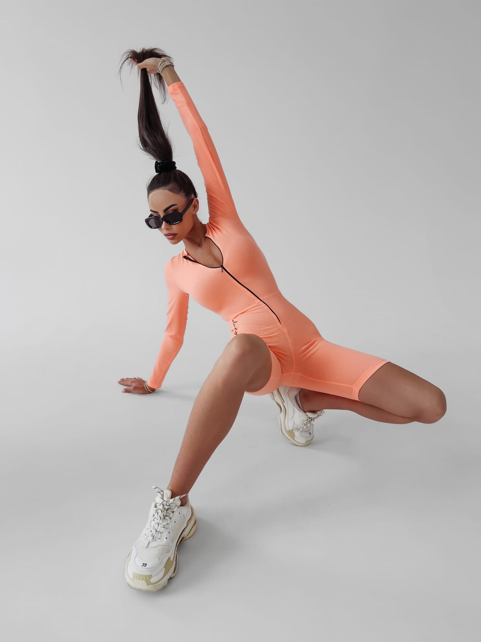 Sportowy, dopasowany kombinezon zapinany na suwak. Długi rękaw i krótka nogawka, na przodzie delikatny haft OLAVOGA w kontrastowym odcieniu. Prążkowany materiał idealnie przylega do ciała. Gotowa stylizacja na spacer, rower czy kawę na mieście.