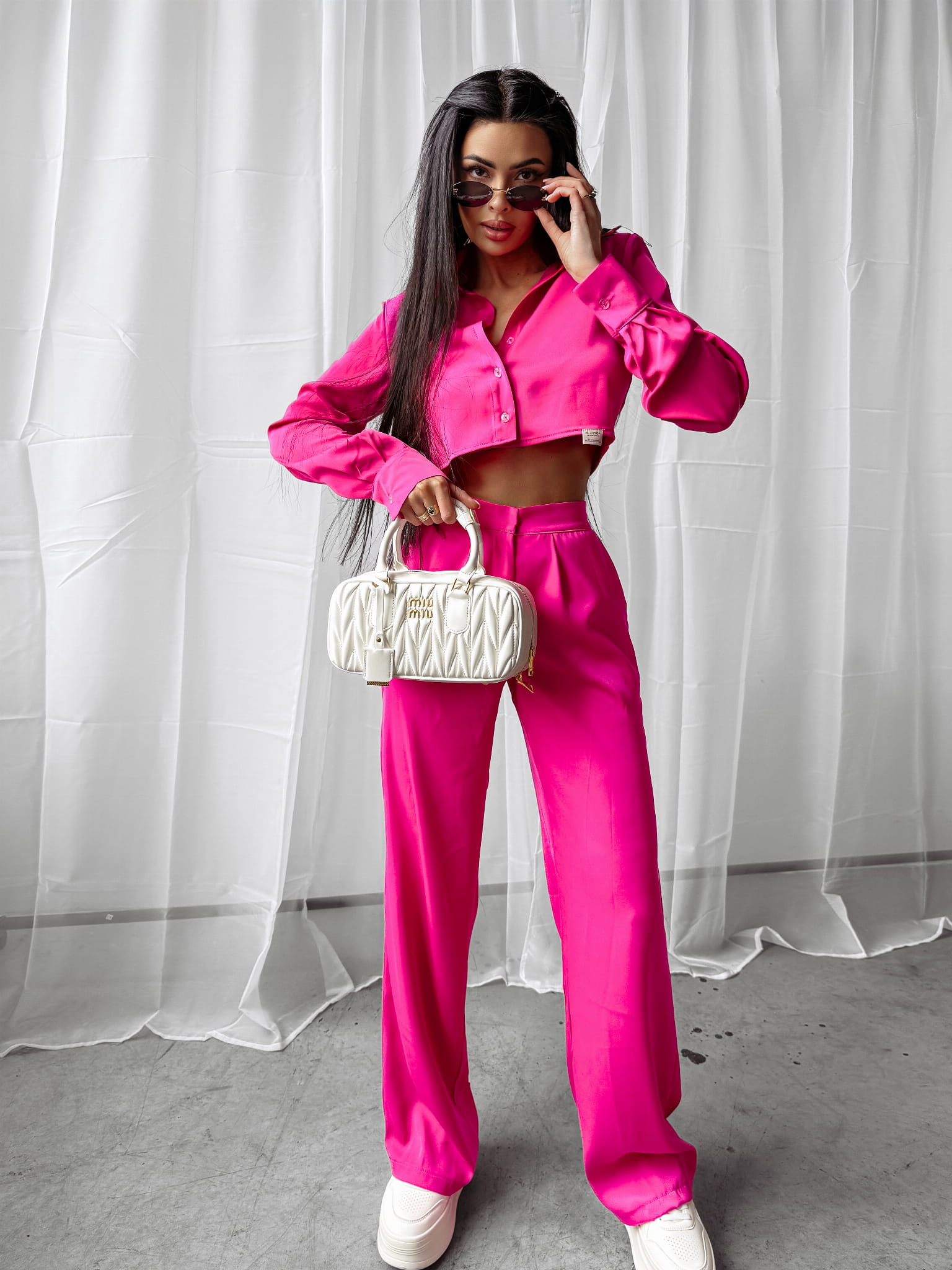 Elegancki komplet damski wykonany z wysokiej jakości oddychającego materiału. Góra - koszula z długim rękawem, zapinana na guziki. Produkt posiada poduszki na ramionach. Na przodzie minimalistyczna, logowana naszywka. Dół - eleganckie, proste spodnie z kieszeniami po bokach. Na tyle znajduje się logowana naszywka.