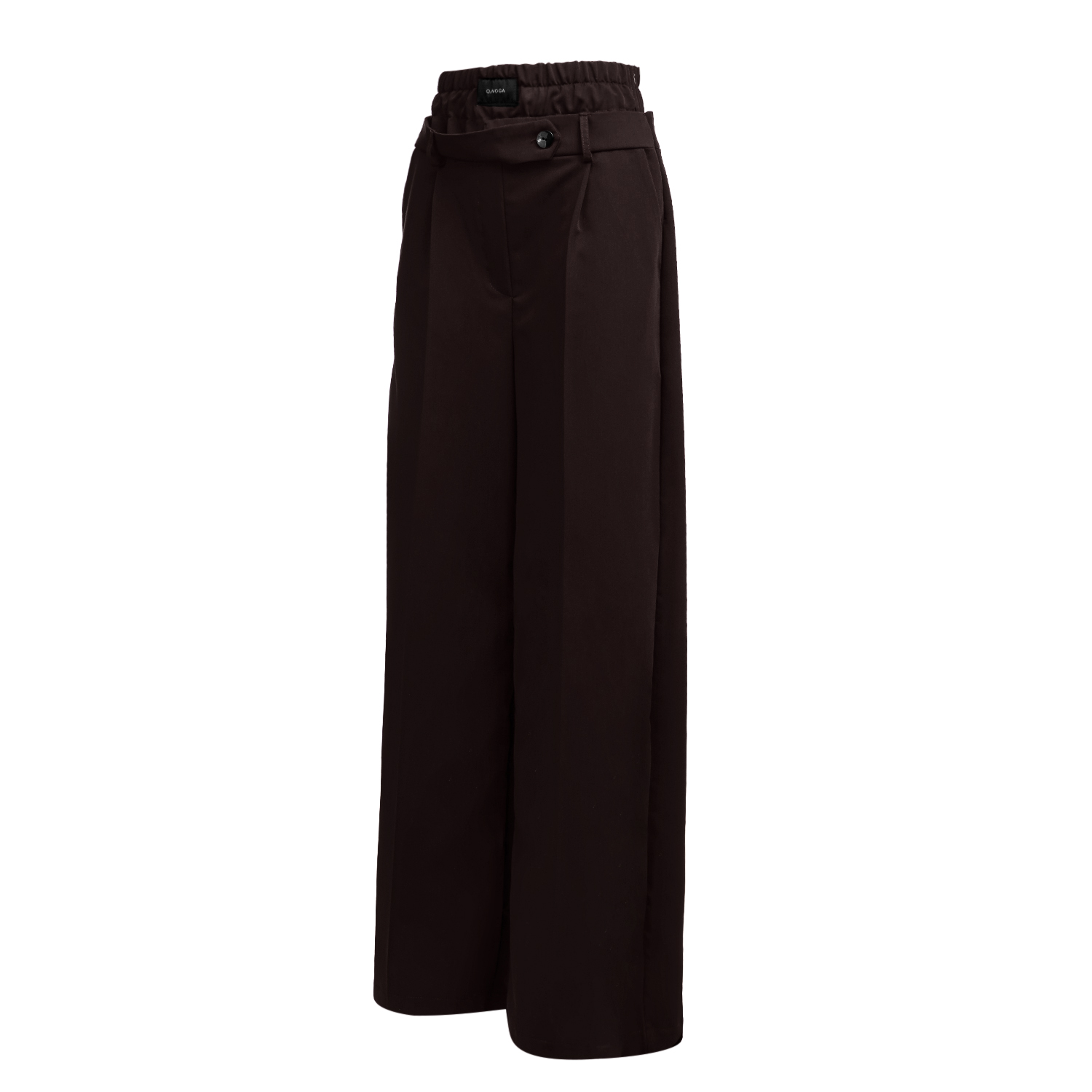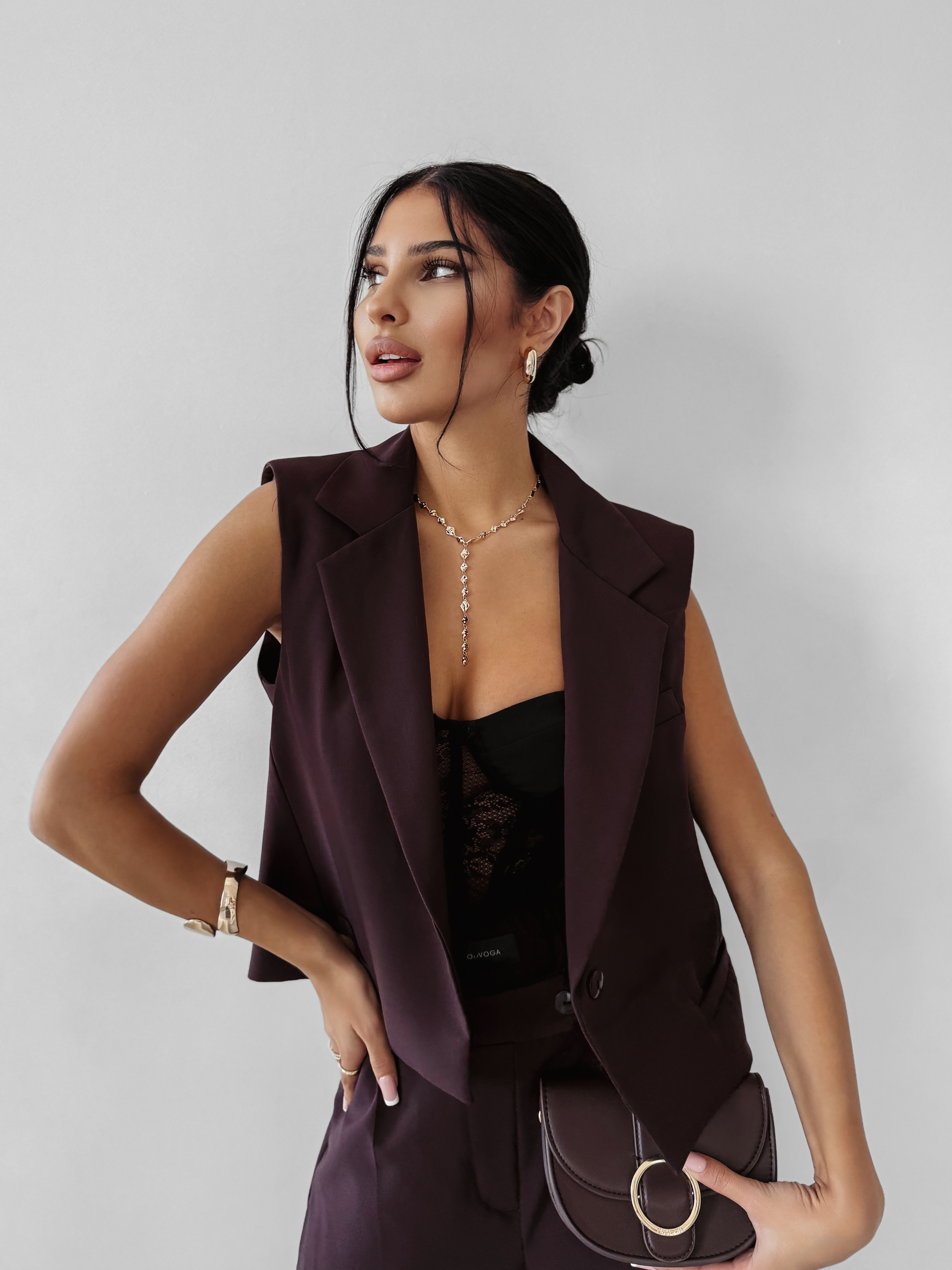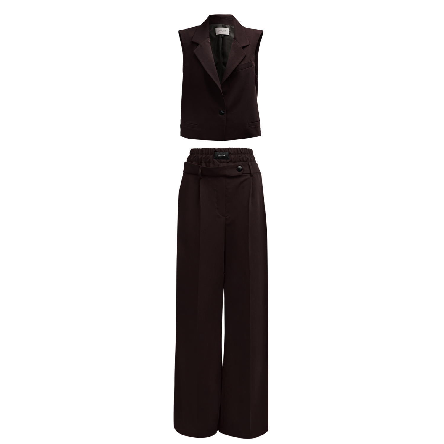 Komplet damski wykonany z wysokiej jakości garniturowego materiału. Góra - kamizelka o klasycznym kroju z klapami i zapięciem na guzik. Dół - eleganckie spodniami z szerokimi nogawkami i elastycznym pasem. Po boku kieszenie. Na przodzie minimalistyczna, logowana naszywka.