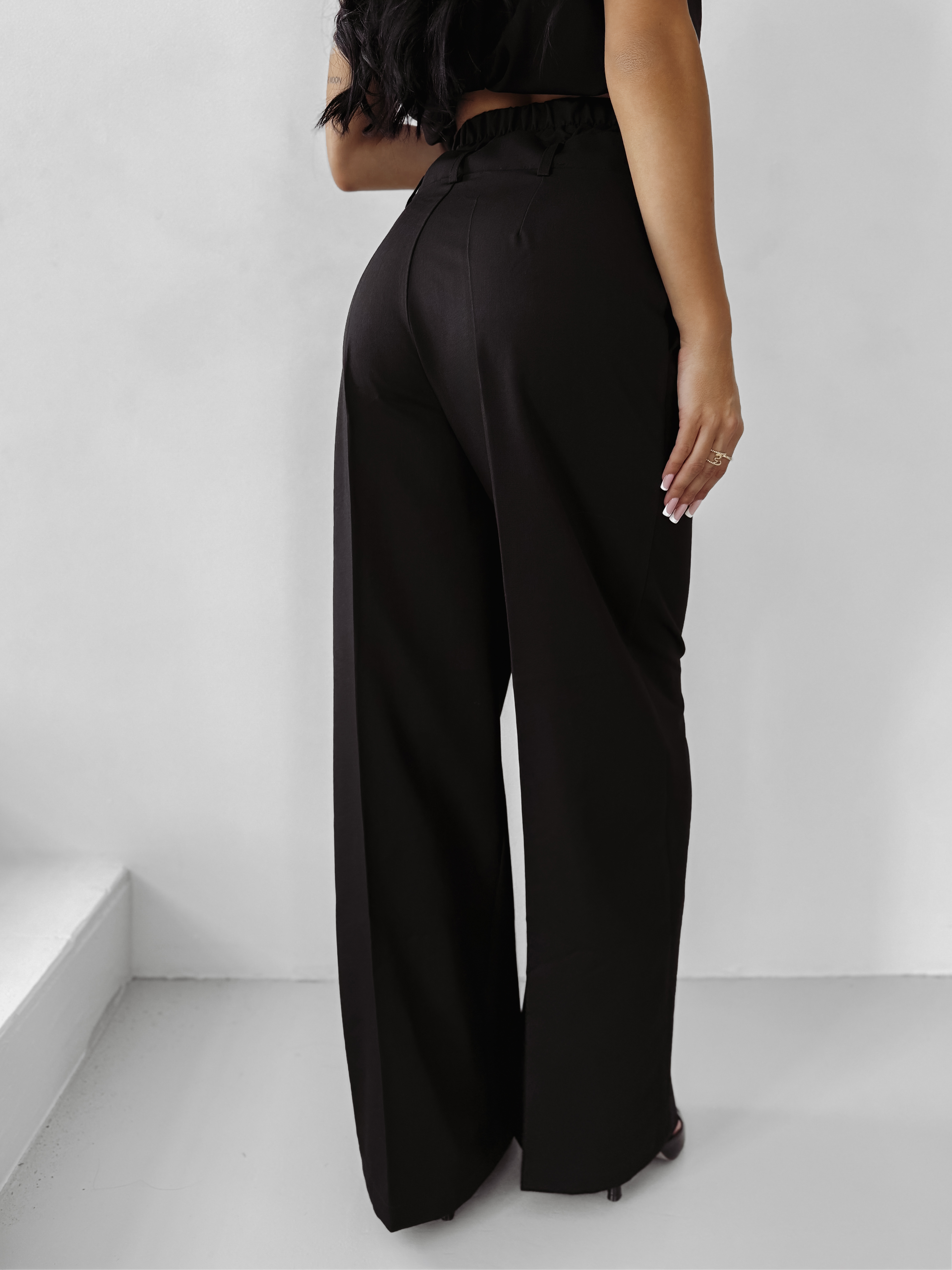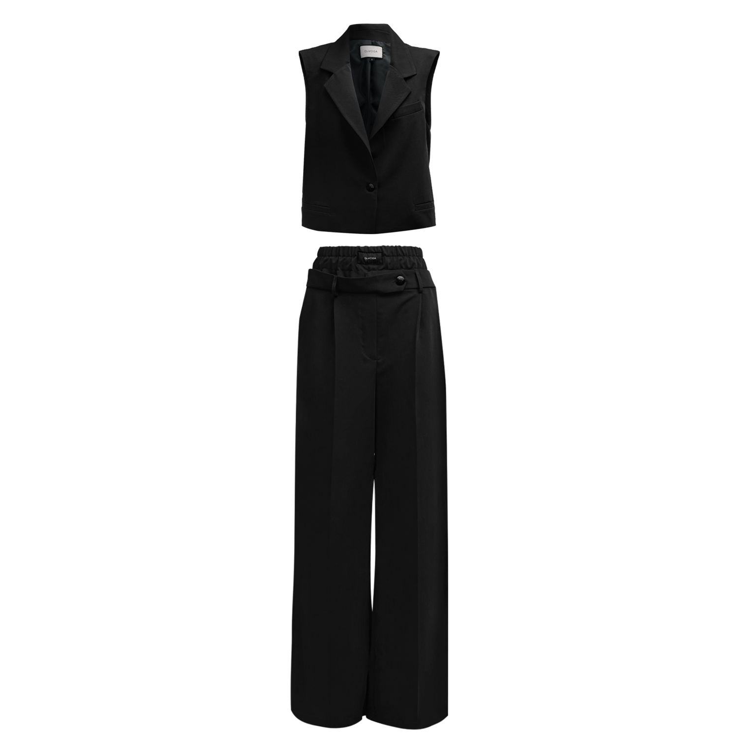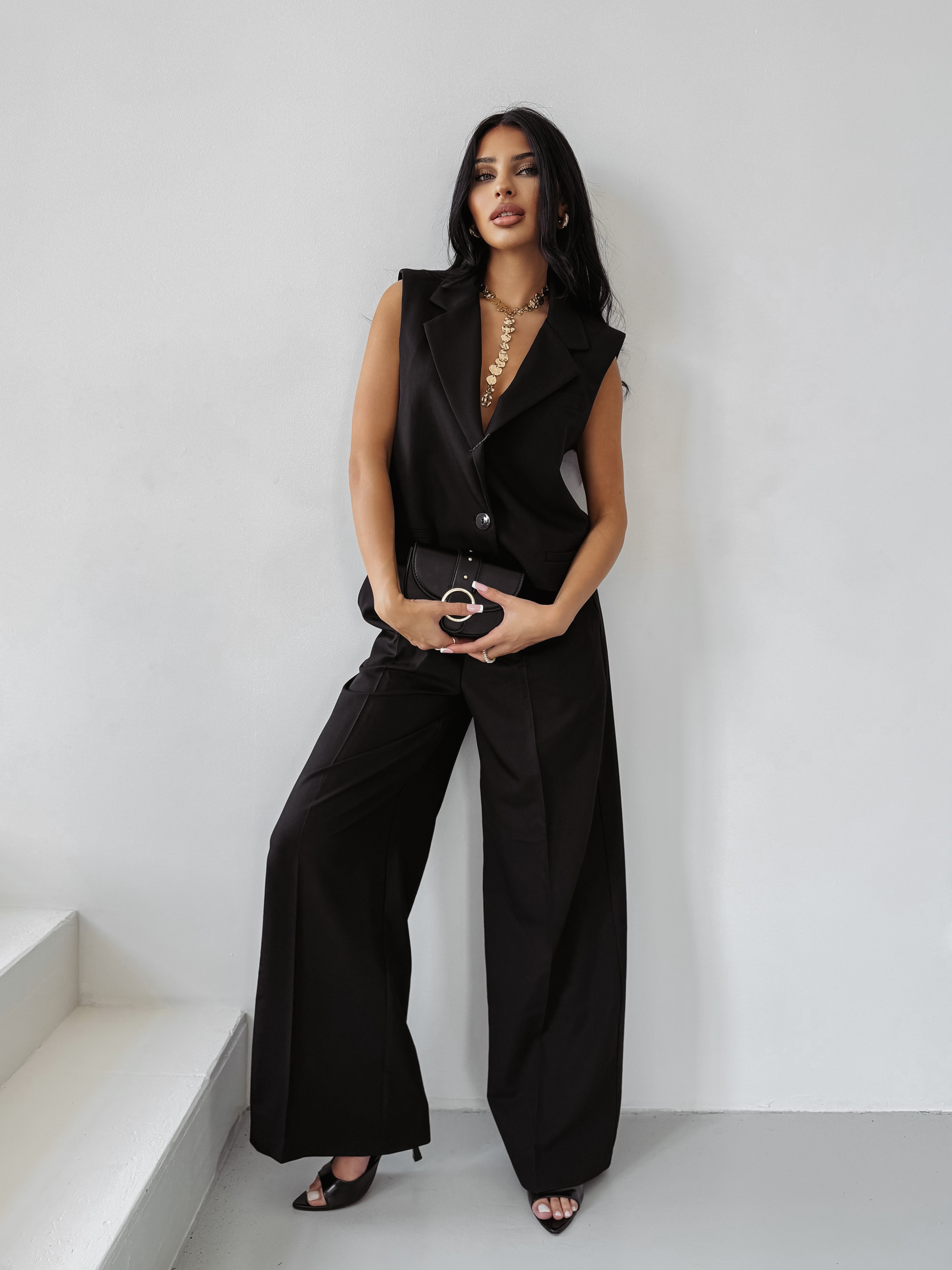 Komplet damski wykonany z wysokiej jakości garniturowego materiału. Góra - kamizelka o klasycznym kroju z klapami i zapięciem na guzik. Dół - eleganckie spodniami z szerokimi nogawkami i elastycznym pasem. Po boku kieszenie. Na przodzie minimalistyczna, logowana naszywka.