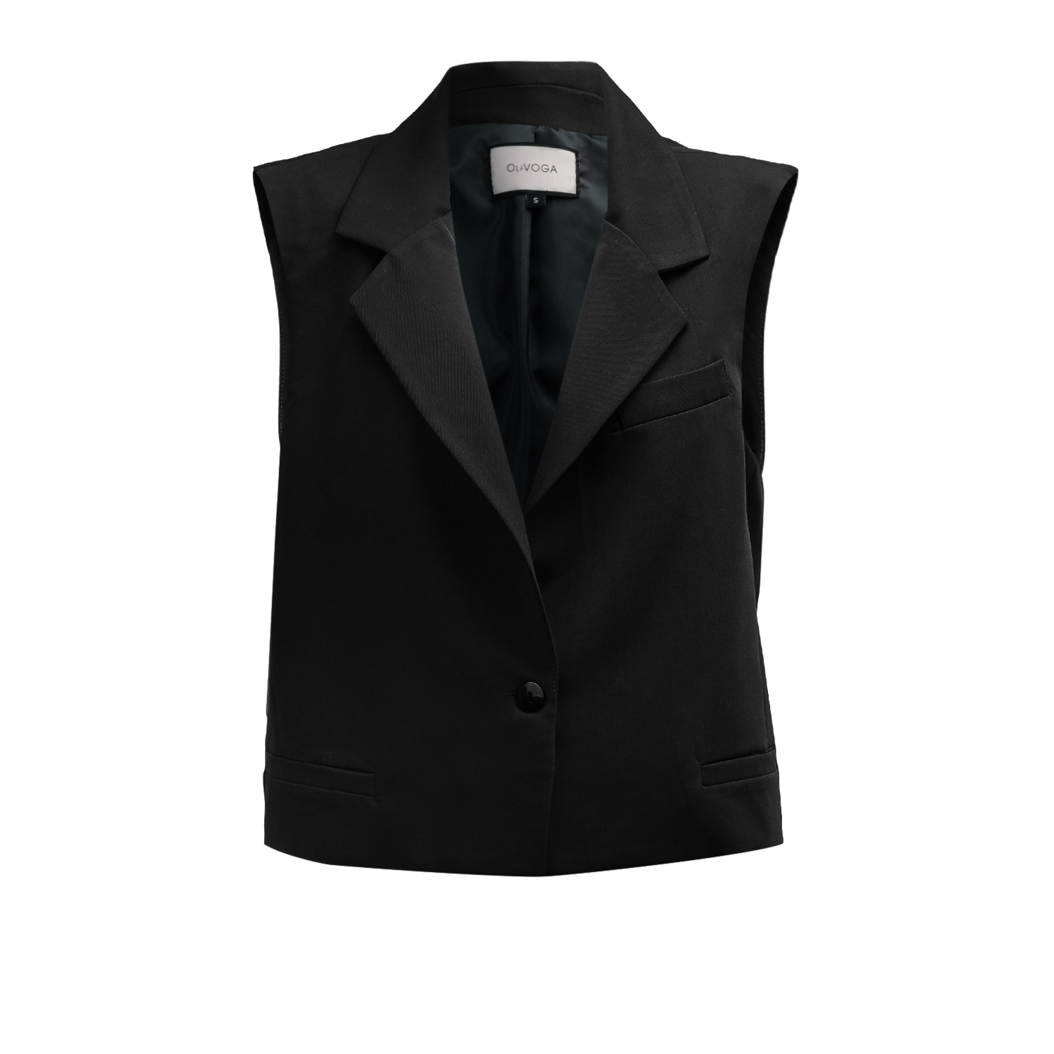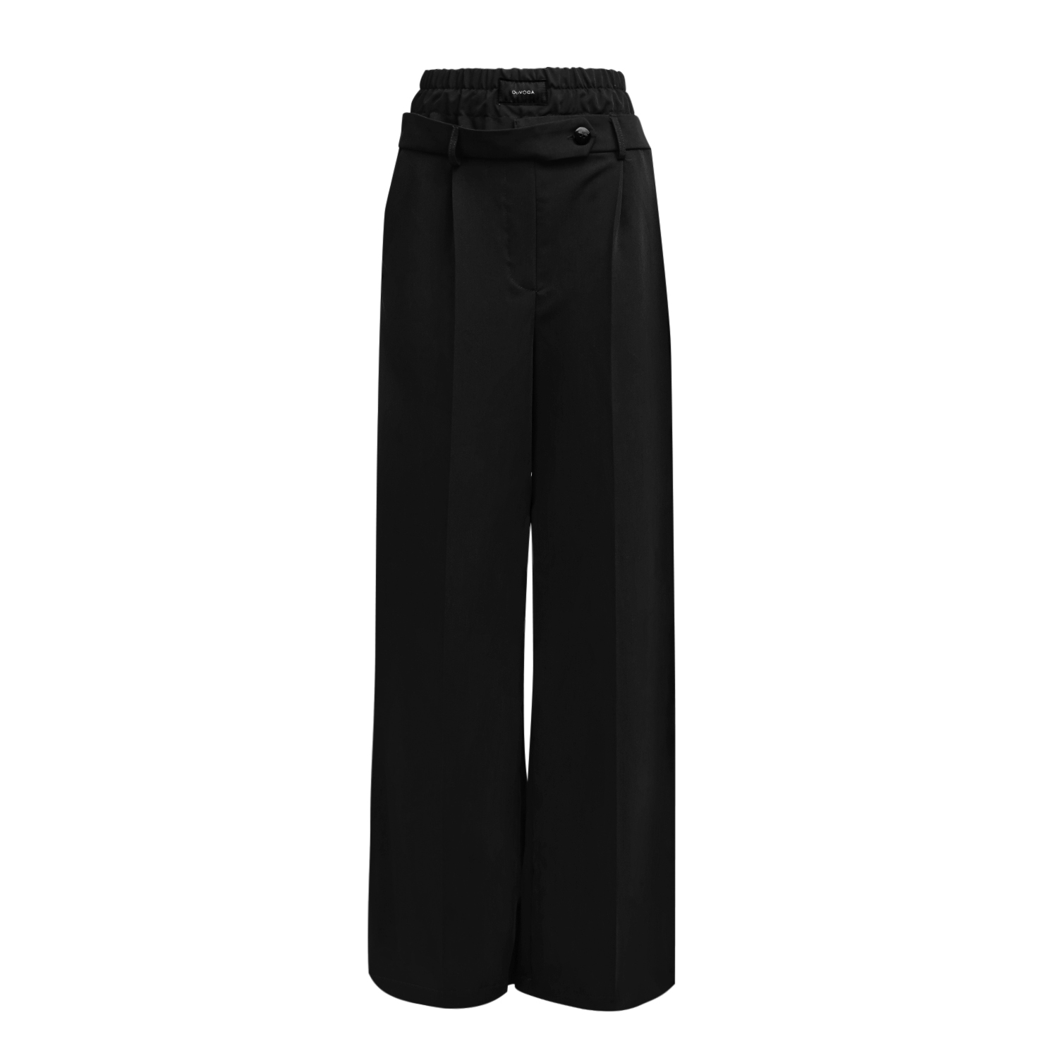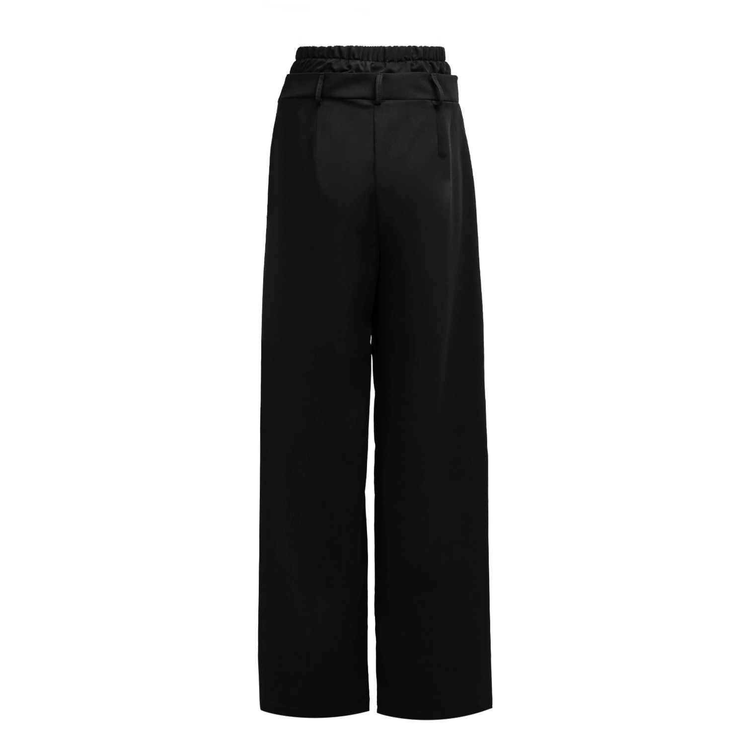 Komplet damski wykonany z wysokiej jakości garniturowego materiału. Góra - kamizelka o klasycznym kroju z klapami i zapięciem na guzik. Dół - eleganckie spodniami z szerokimi nogawkami i elastycznym pasem. Po boku kieszenie. Na przodzie minimalistyczna, logowana naszywka.