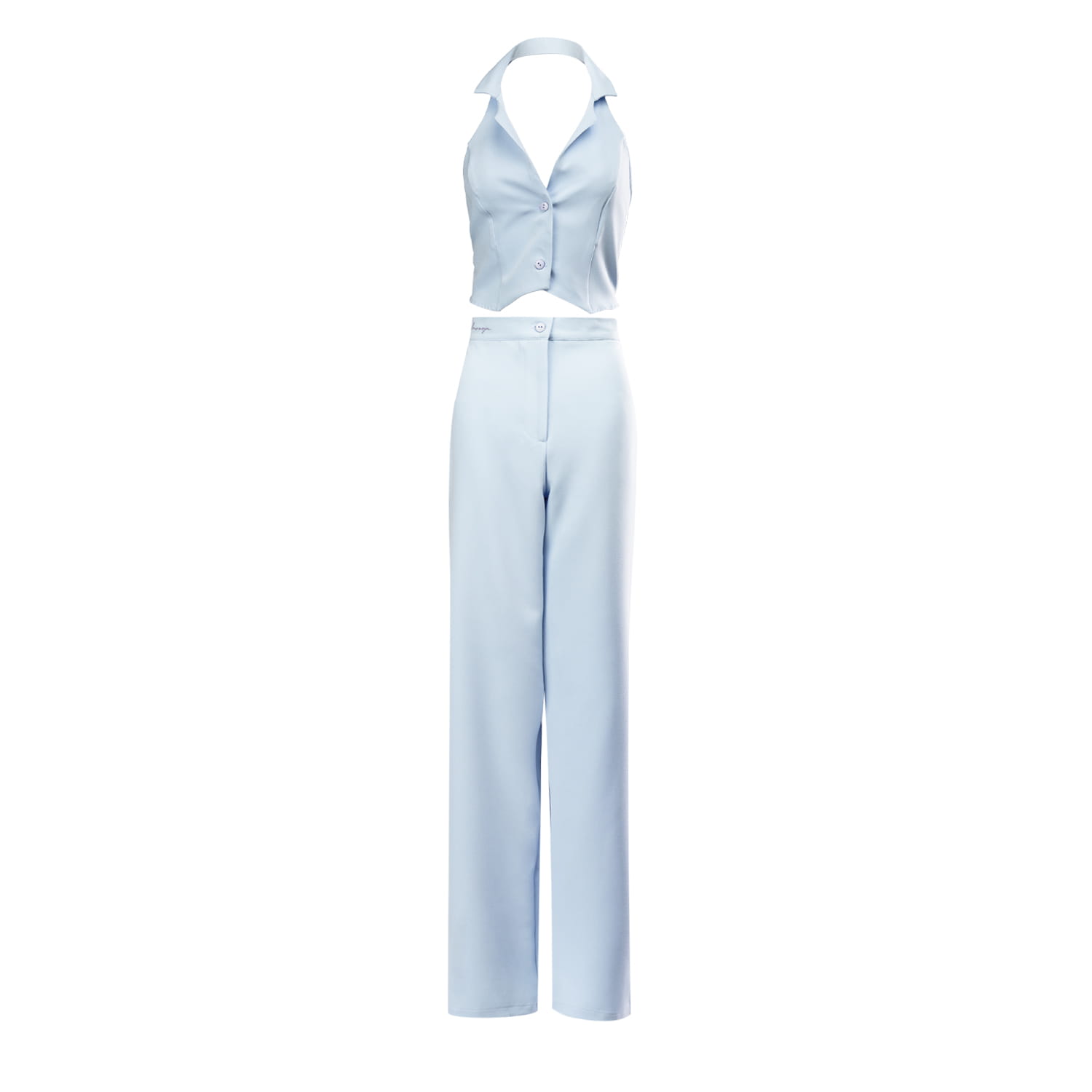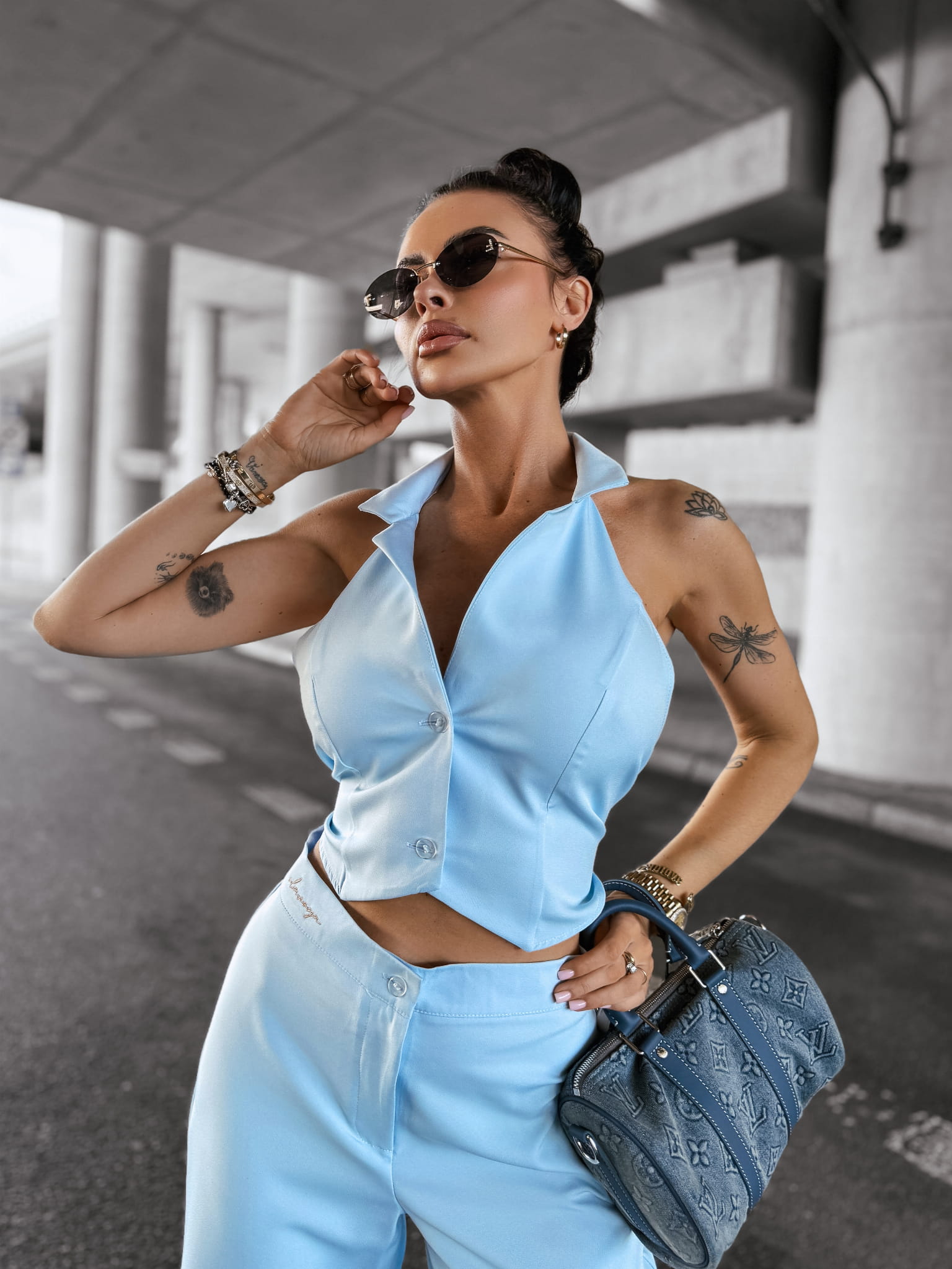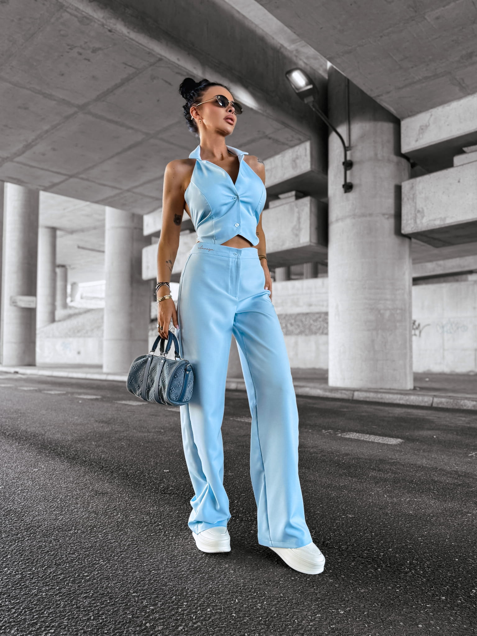 Elegancki komplet wykonany z wysokiej jakości oddychającego materiału. Góra - kamizelka z wiązaniem na plecach. Posiada kołnierz. Dół - eleganckie spodnie z wysokim stanem. Nogawki rozszerzane ku dołowi. Na przodzie minimalistyczny pisany haft z logo marki OLAVOGA.