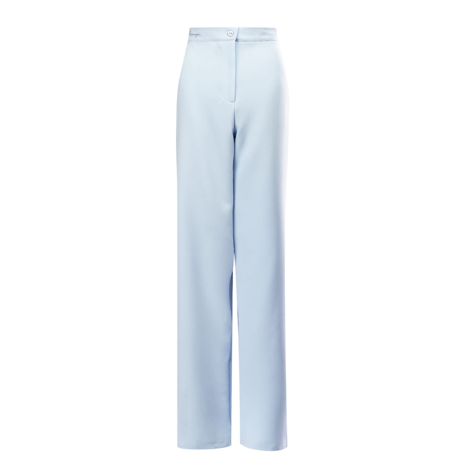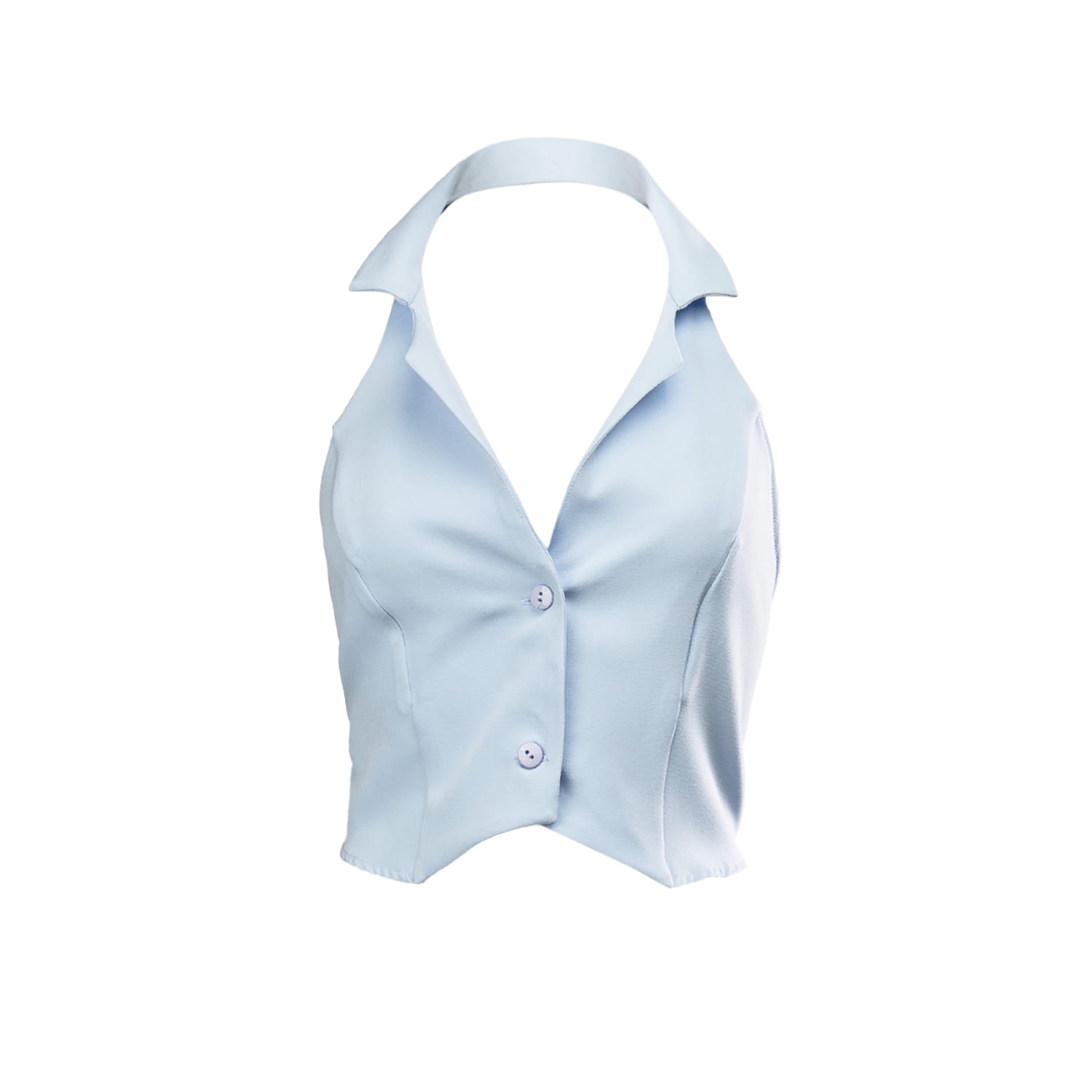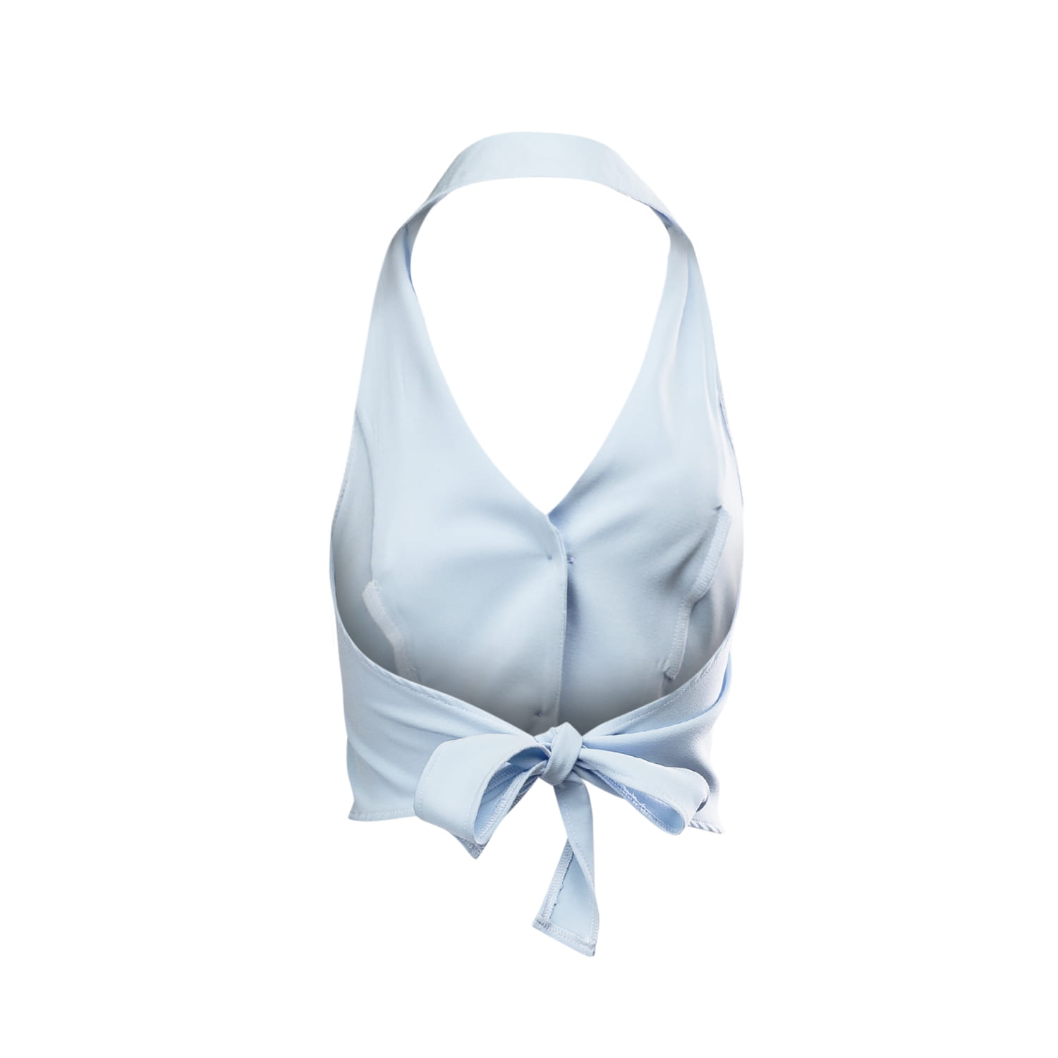 Elegancki komplet wykonany z wysokiej jakości oddychającego materiału. Góra - kamizelka z wiązaniem na plecach. Posiada kołnierz. Dół - eleganckie spodnie z wysokim stanem. Nogawki rozszerzane ku dołowi. Na przodzie minimalistyczny pisany haft z logo marki OLAVOGA.