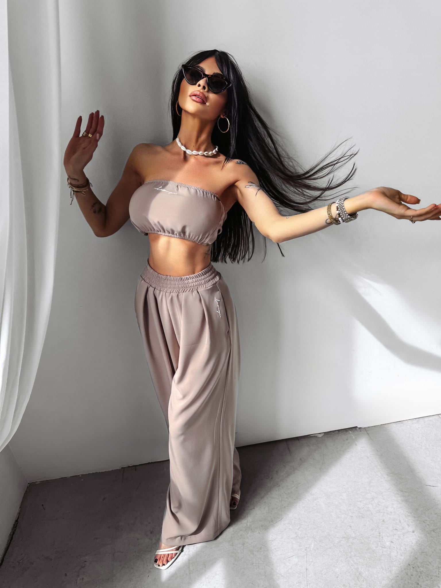 Komplet wykonany z wysokiej jakości oddychającego, przewiewnego materiału. Góra- top typu bandeau z wiązaniem na tyle. Dół- spodnie z szerokimi nogawkami, po bokach kieszenie. Obydwie części kompletu posiadają pisany haft z logo marki.