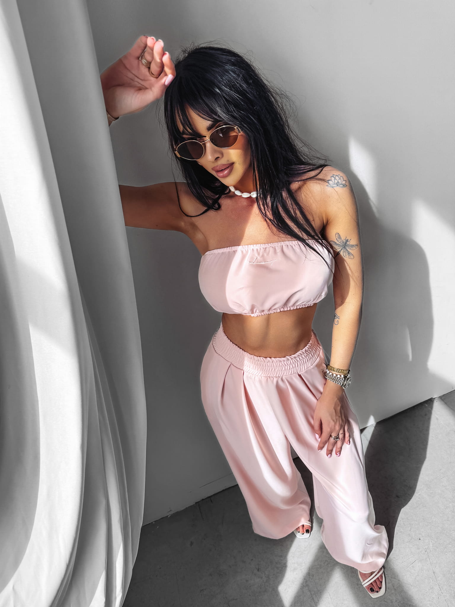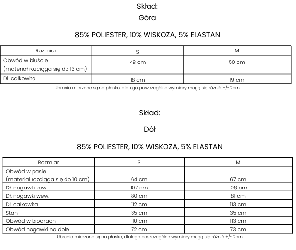 Komplet wykonany z wysokiej jakości oddychającego, przewiewnego materiału. Góra- top typu bandeau z wiązaniem na tyle. Dół- spodnie z szerokimi nogawkami, po bokach kieszenie. Obydwie części kompletu posiadają pisany haft z logo marki.
