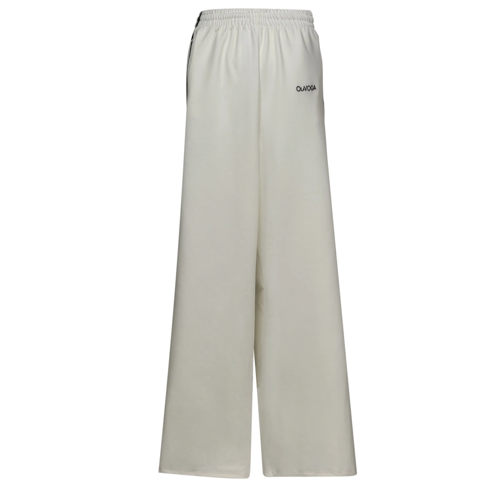 Poszerzane spodnie wykonane z wysokiej jakości materiału. Po bokach zapinane kieszenie. Elastyczny pas z praktycznym sznurkiem do regulacji. Białe lampasy wzdłuż nogawek. Z przodu subtelny haft z logo marki OLAVOGA.