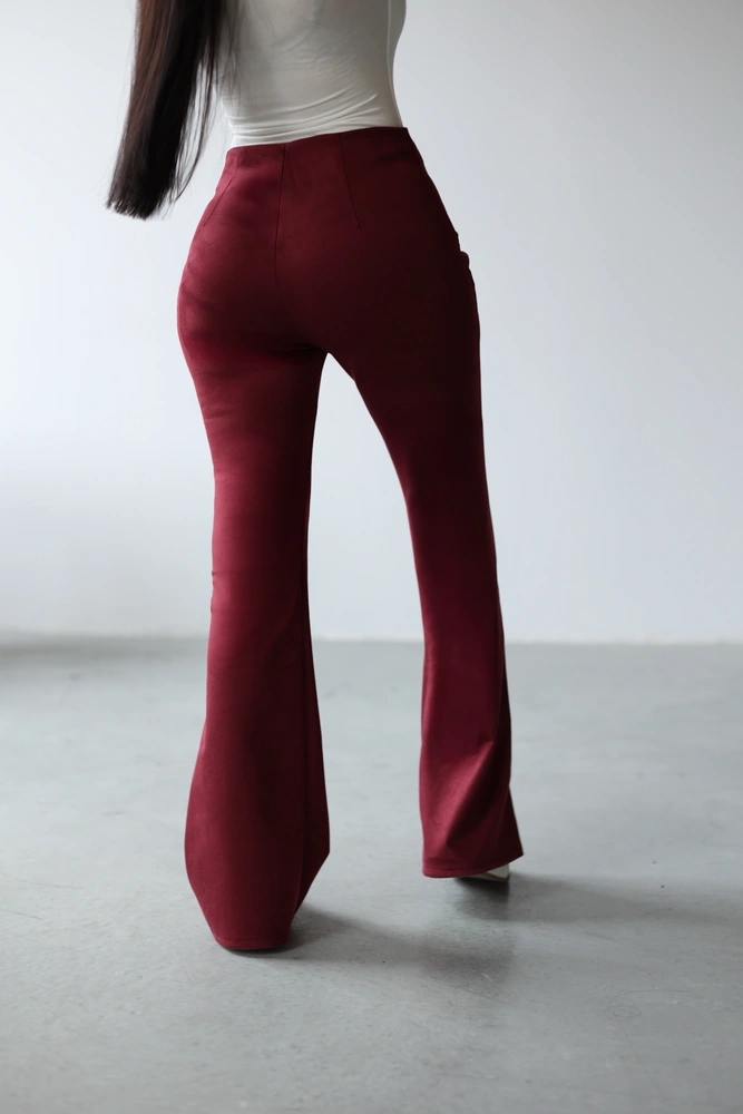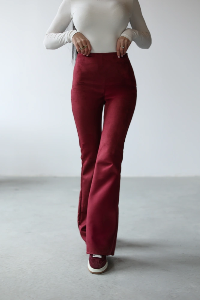 Zamszowe spodnie z odpowiadającym im wariantem kolorystycznym suwakiem. Wykonane z wysokiej jakości materiału. Nogawki rozszerzane ku dołowi. Na przodzie minimalistyczny haft z logo marki OLAVOGA.
