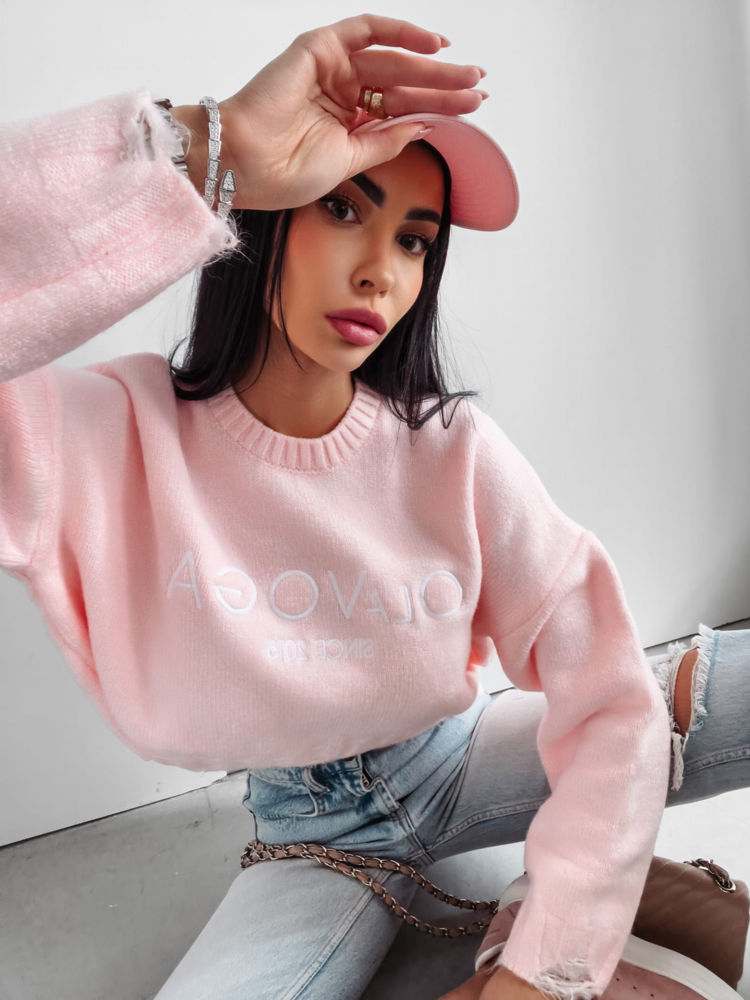 Delikatnie oversizowy sweter uszyty z prążkowanej dzianiny, z efektem szarpania na rękawach i na dole modelu. Na przodzie logo marki OLAVOGA SINCE 2015. Okrągły dekolt zakończony prążkowanym ściągaczem.
