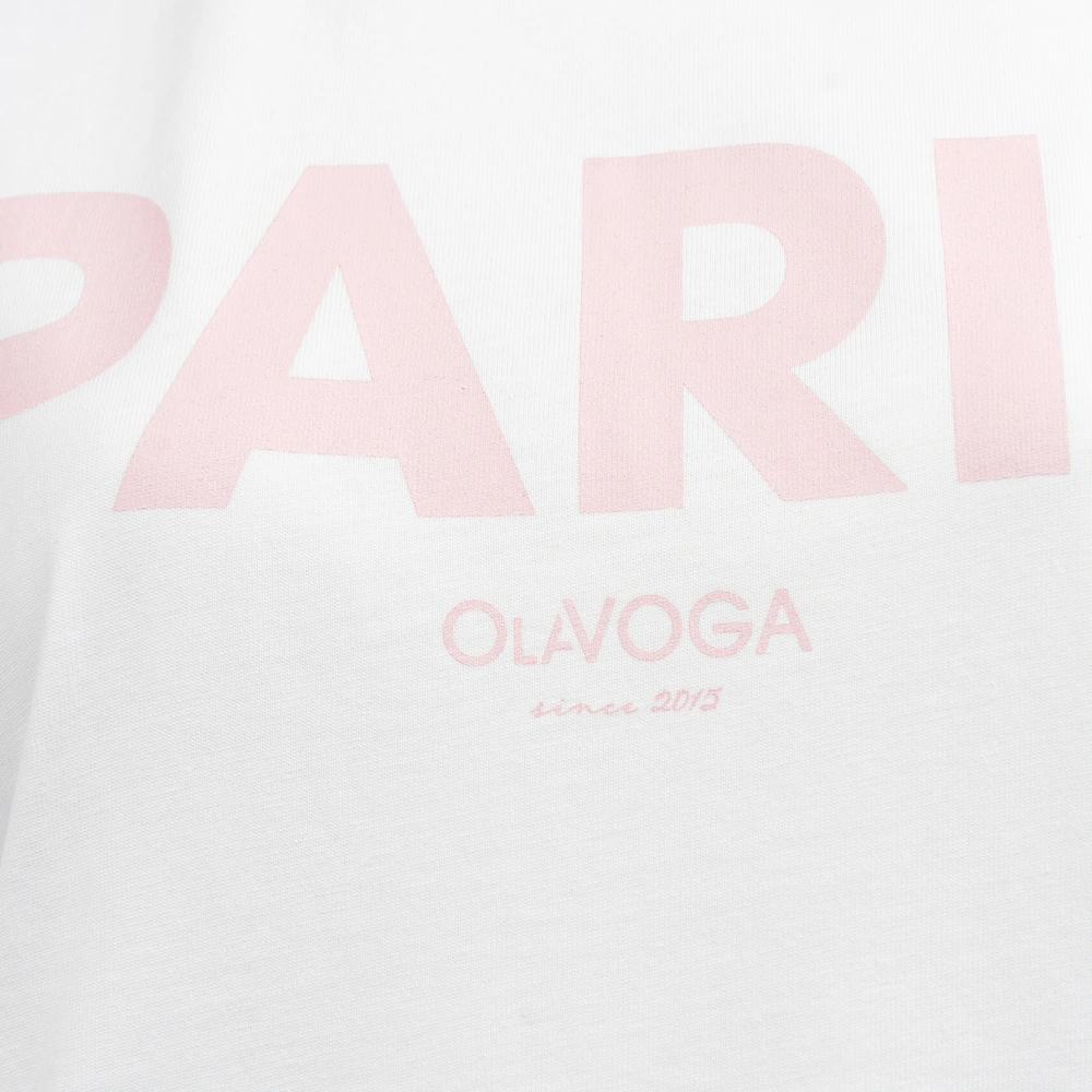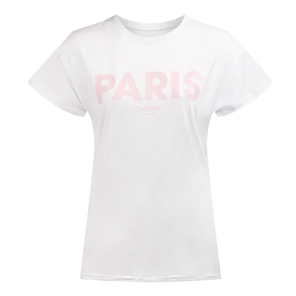 T-shirt z krótkim rękawem, o prostym kroju. Wykonany w 100% z bawełny. Produkt posiada podwinięte rękawy. Na przodzie obszerny napis PARIS z minimalistycznym logo marki OLAVOGA.