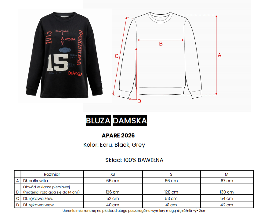 Bluza o oversiz’owym kroju - wykonana z wysoko gatunkowej bawełny - okrągły klasyczny dekolt wykonany ze ściągacza - na przodzie wieloelementowy nadruk z logo OLAVOGA, typografią oraz numerem 15 w kontrastowej kolorystyce - rękaw o przedłużonej o lekko opadającej linii zakończone ściągaczem - na dole rękawa delikatny kontrastowy haft OLV.