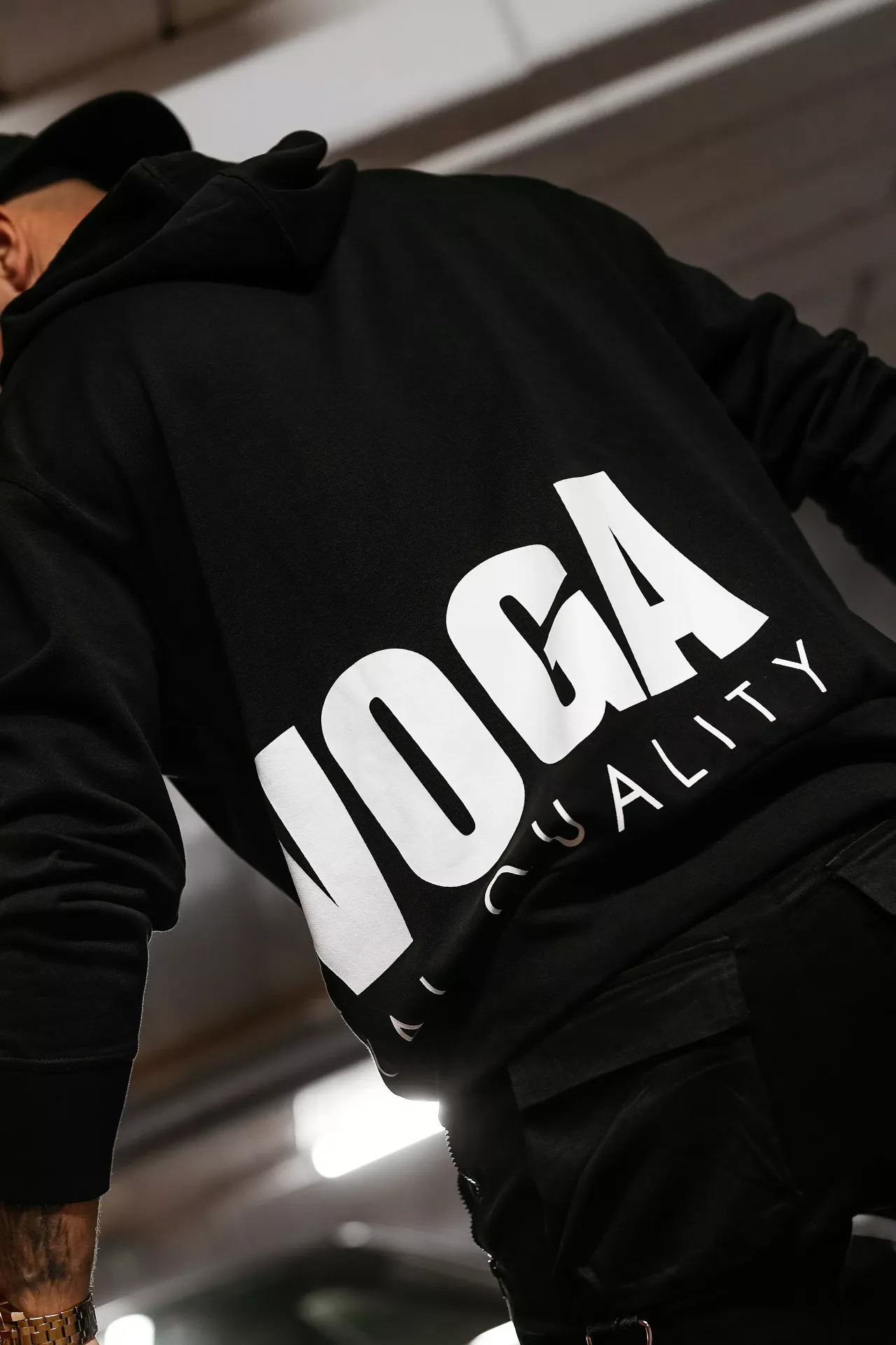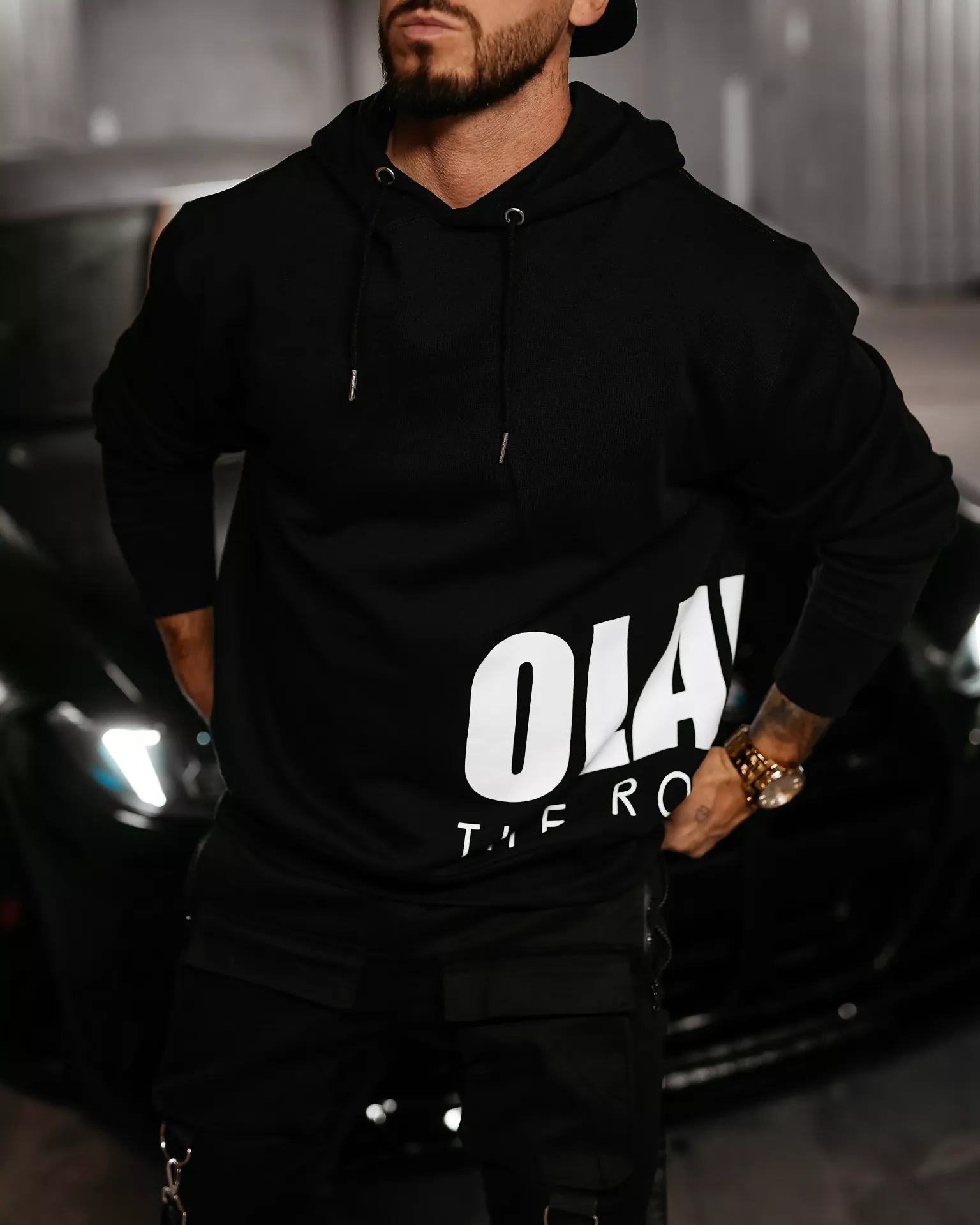 Casualowa bluza męska z kapturem. Wykonana w 100% z materiału bawełnianego. Posiada obszerny kaptur z regulacją. Produkt zdobi wyrazisty nadruk z logo marki OLAVOGA oraz z napisem THE ROYAL QUALITY z przodu i z tyłu.