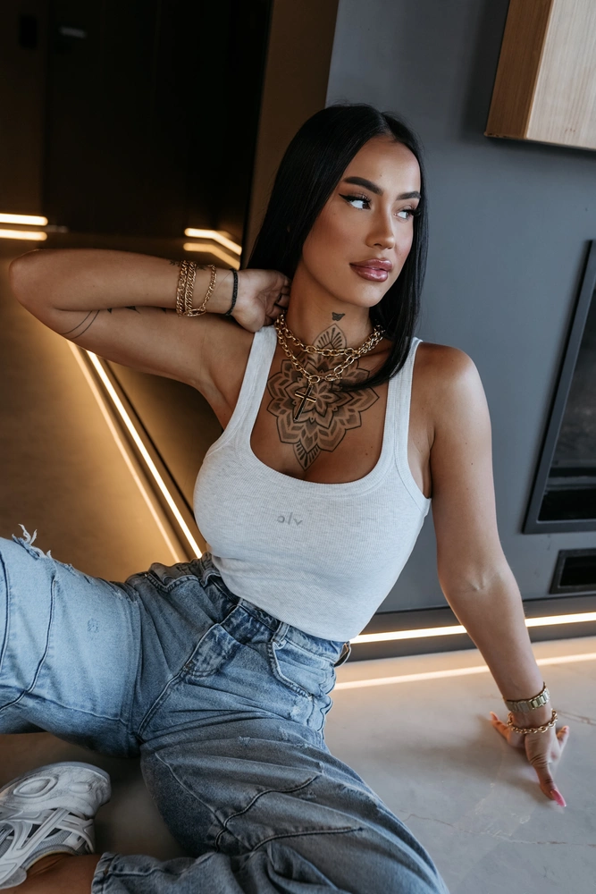 Dopasowany model - minimalistyczny krój - góra na szerszych ramiączkach - głęboki delikatnie zaokrąglony dekolt - subtelnie modeluje talię - na froncie znajduje się subtelne logo OLV - body zapinane na napy.