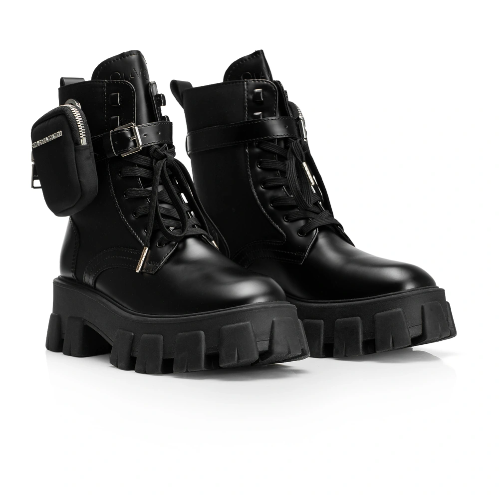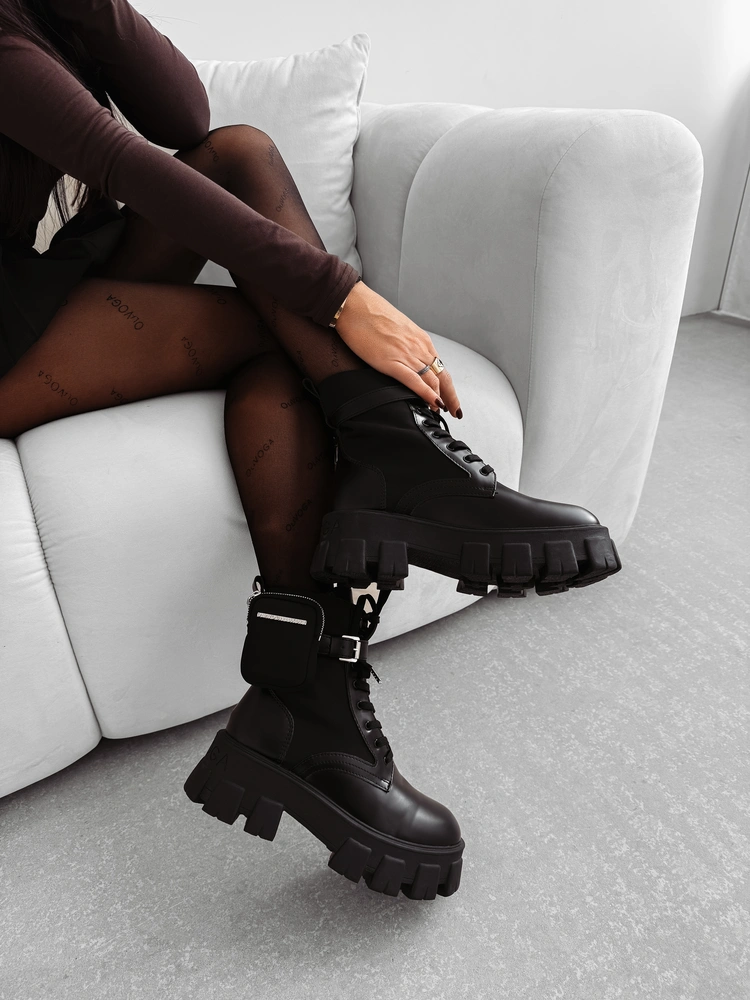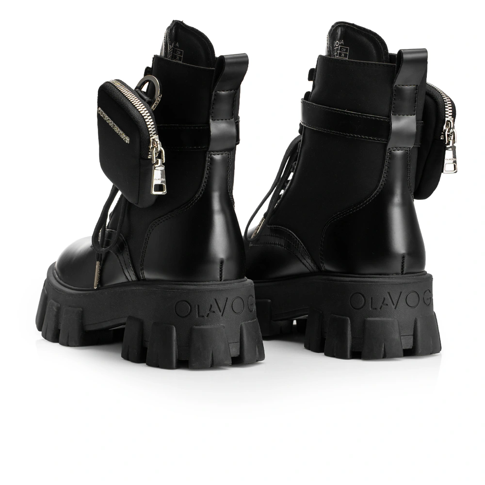 Workery damskie z masywną formę z nowoczesnym designem. Wykonane z wysokiej jakości skóry ekologicznej, posiadają grubą, żłobioną podeszwę z tłoczonym logo marki OLAVOGA z tyłu oraz odpinaną mini saszetkę przy kostce – praktyczny i efektowny detal. Sznurowane, z dodatkowym paskiem i klamrą.