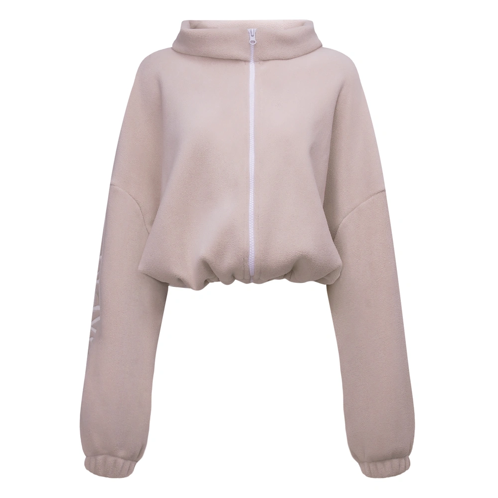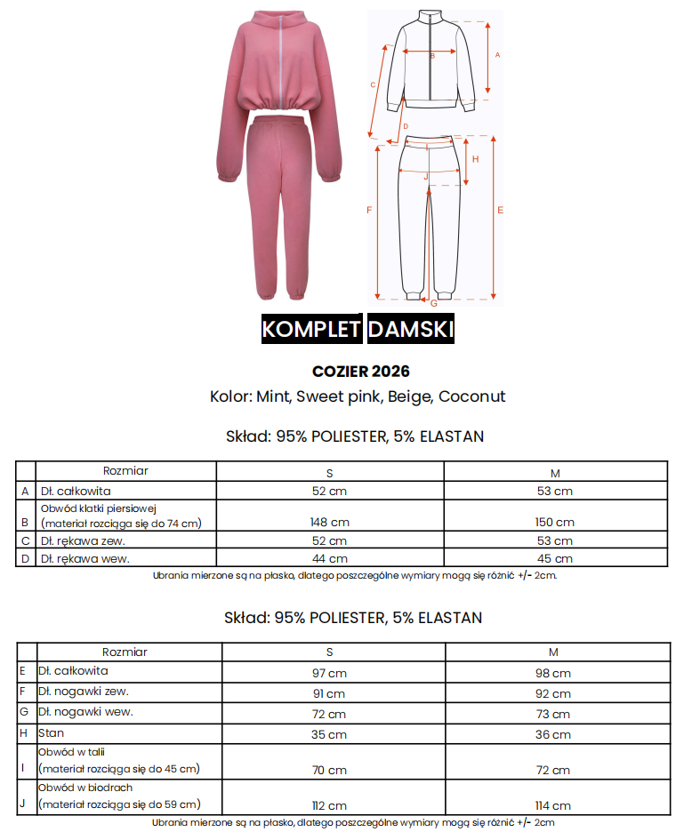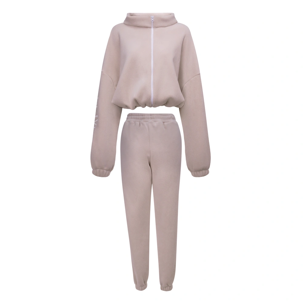 Casualowy komplet wykonany z miękkiej, przyjemnej w dotyku dzianiny polarowej o subtelnej, jednolitej strukturze. Góra - krótka bluza zapinana na suwak, o luźnym, lekko oversize’owym kroju. Model z długim rękawem, zakończonym elastycznym ściągaczem. Na rękawie umieszczone wyraziste, haftowane logo marki OLAVOGA. Dół - spodnie z wysokim stanem i elastyczną talią. Nogawki o prostym kroju, zwężane ku dołowi i wykończone ściągaczem.