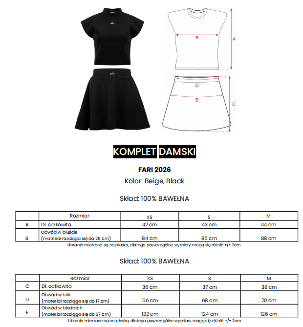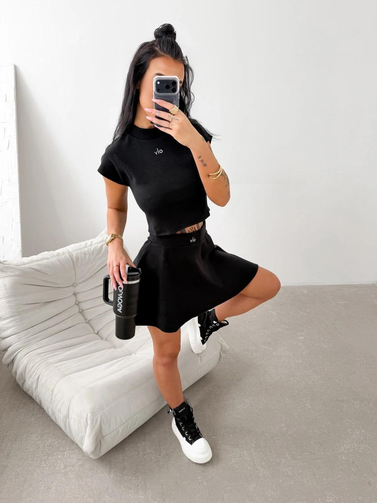 Top o skróconym kroju - krótki rękaw z wyraźnie zaznaczona linia ramion - dekolt ze stójką - na przodzie subtelne haftowane logo w kontrastowym kolorze - spódnica o lekko rozkloszowanym fasonie - długość mini - subtelny haft OLV w pasie - wysokogatunkowa dzianina.