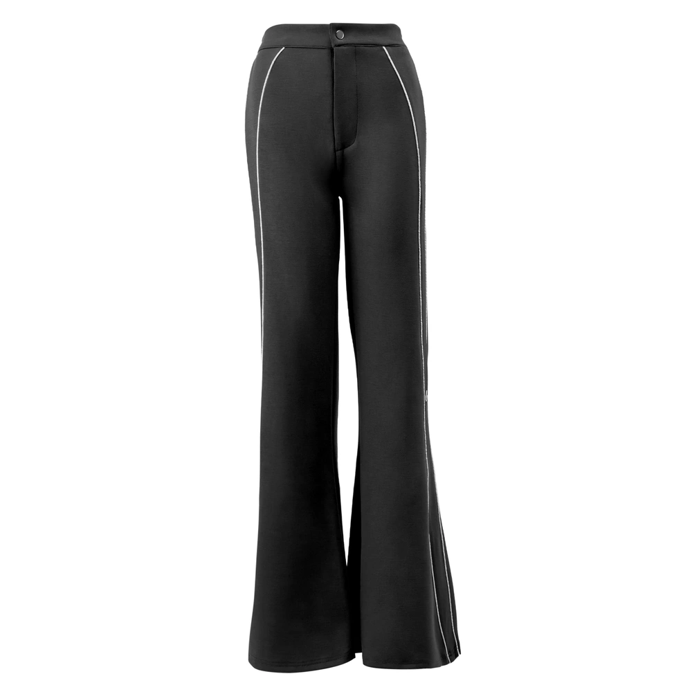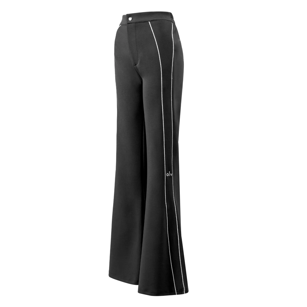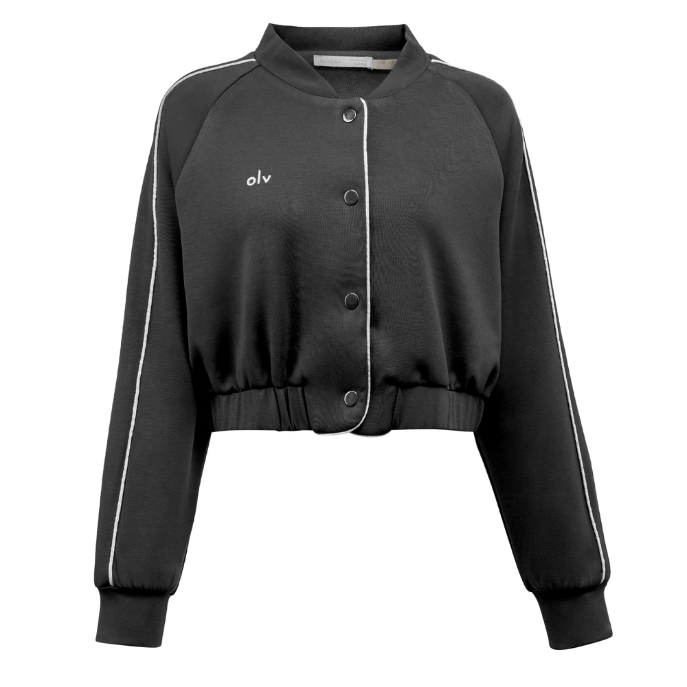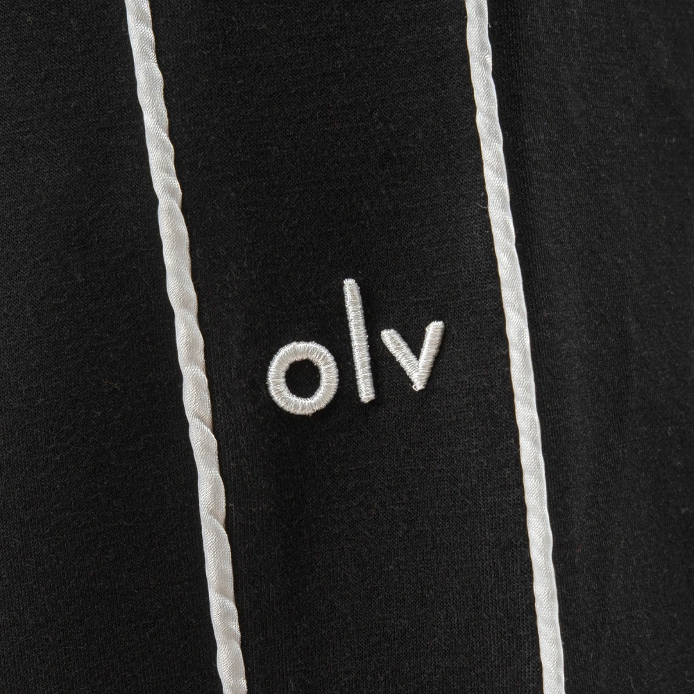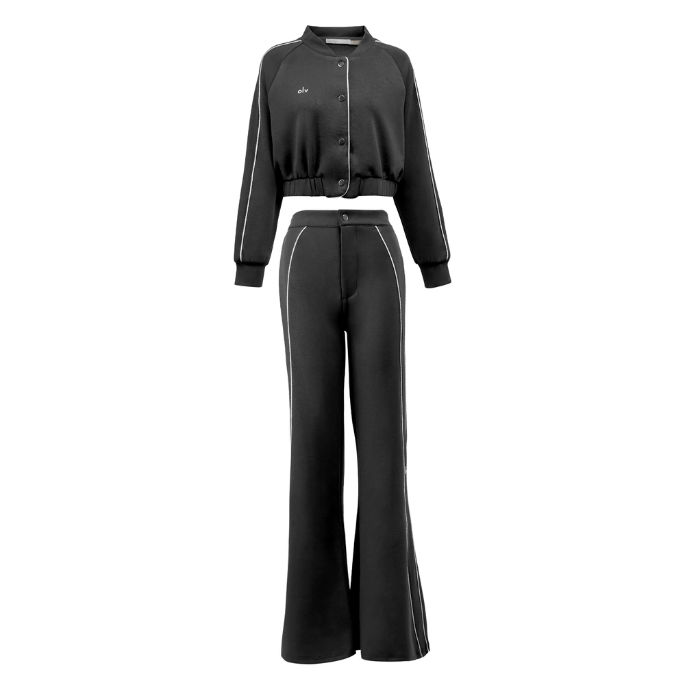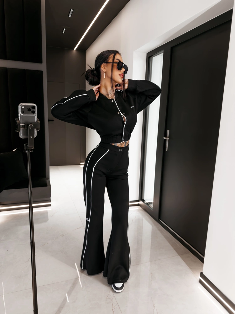 Komplet z miękkiej elastycznej dzianiny - bluza o krótszym fasonie - zapinana na metaliczne napy - długie rękawy zakończone ściągaczami - elastyczne wykończenie talii - spodnie z wysokim stanem - nogawka długa rozszerzana ku dołowi typu flare - spodnie zapinane na metaliczny guzik i zamek - w komplecie wszyty kontrastowy pionowy piping - delikatne haftowane logowania OLV.