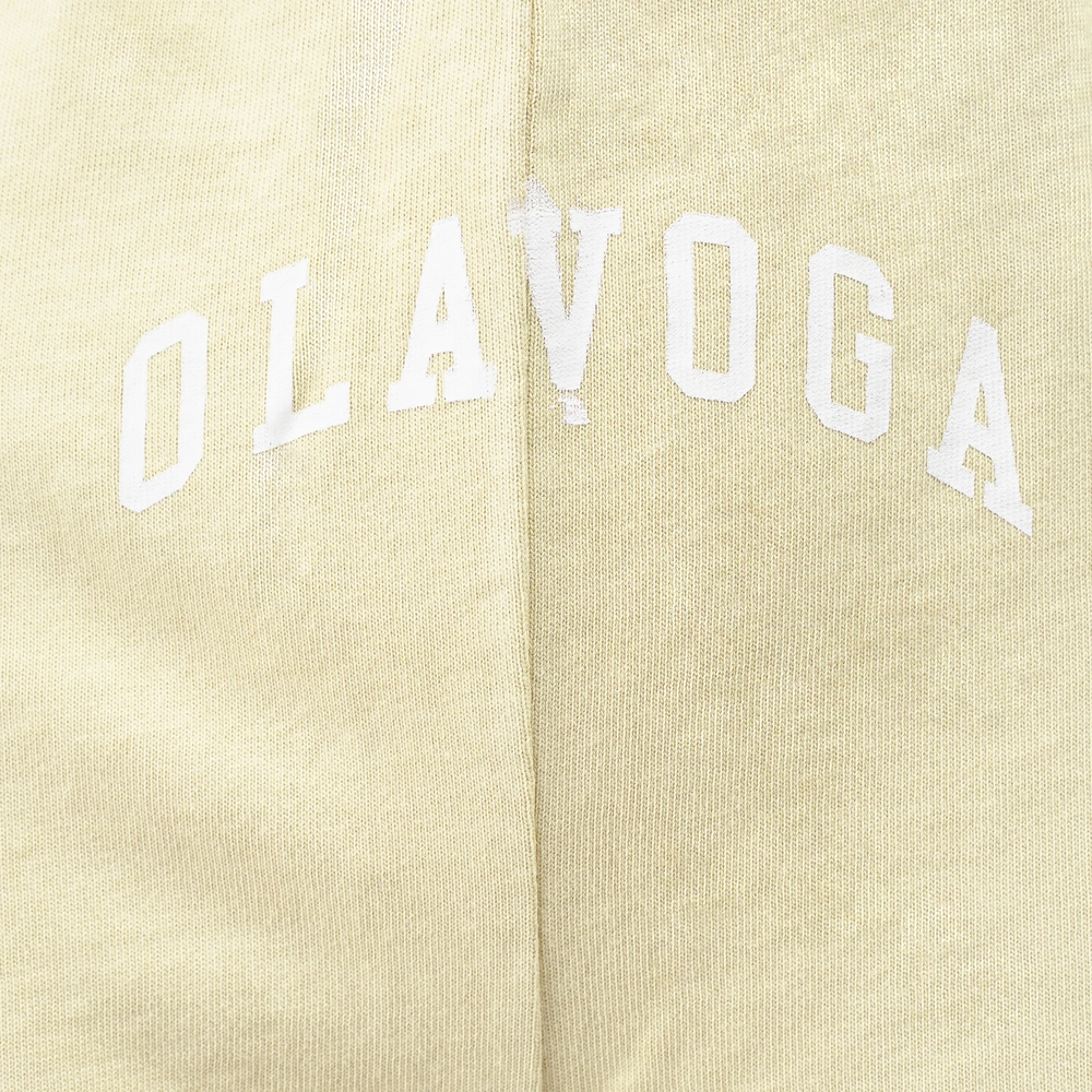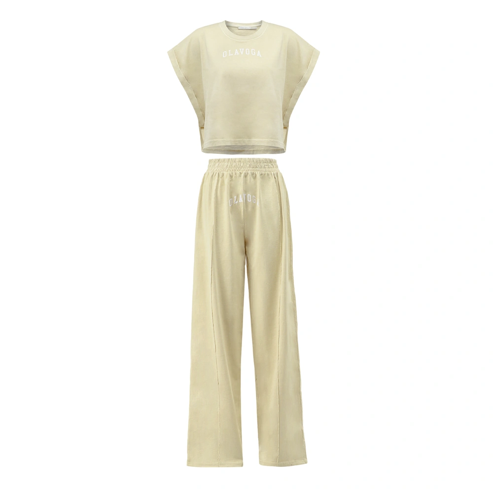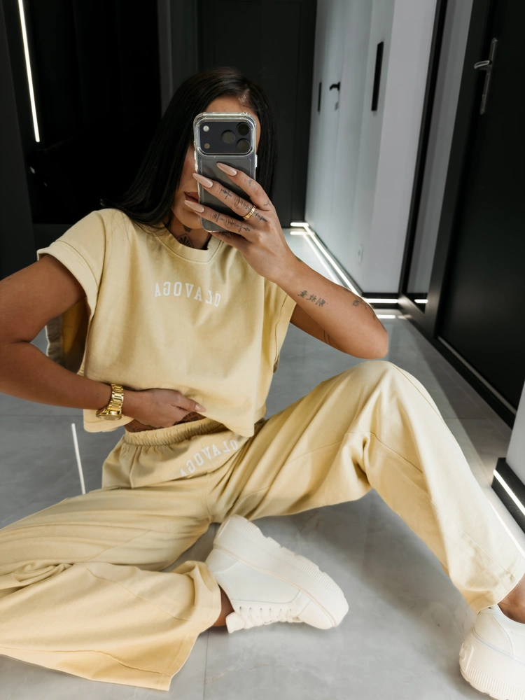 Komplet z wysokogatunkowej bawełny o gramaturze 270g - krótki top o luźnym kroju boxy - szerokie rękawy typu cap sleeve - okrągły dekolt - spodnie z wysokim stanem i elastyczną talią - długa, szeroka nogawka z przeszytym kantem - washed effect na całości - sitodruk z kontrastowym logo brandu na topie i spodniach.