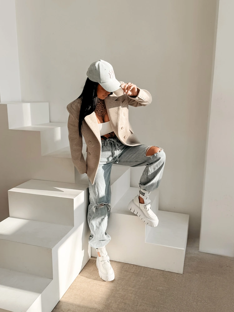 Elegancka marynarka o dopracowanym charakterze, utrzymana w nowoczesnej, minimalistycznej formie. Wykonana z wysokiej jakości materiału o miękkiej, lekko strukturalnej powierzchni. Klasyczny, taliowany krój. Model dwurzędowy, zapinany na guziki, z wyraźnie zaznaczoną linią ramion i klasycznym kołnierzem z klapami. Na przodzie dekoracyjne patki kieszeniowe oraz precyzyjne cięcia modelujące sylwetkę. Tył zdobi subtelna, logowana naszywka OLAVOGA. Rękawy wykończone guzikami.