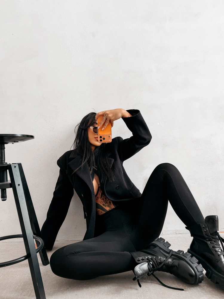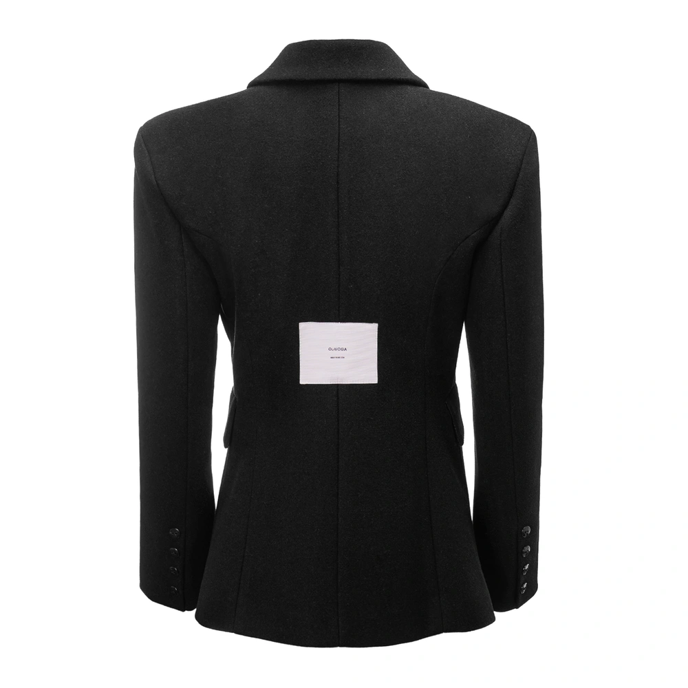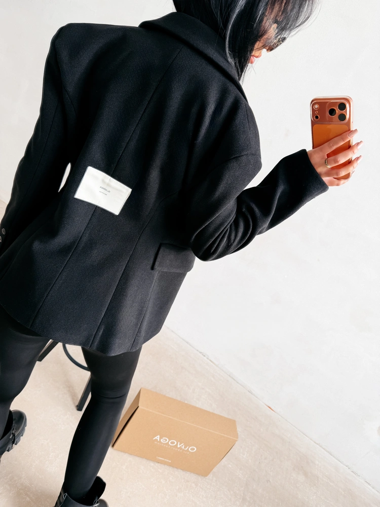 Elegancka marynarka o dopracowanym charakterze, utrzymana w nowoczesnej, minimalistycznej formie. Wykonana z wysokiej jakości materiału o miękkiej, lekko strukturalnej powierzchni. Klasyczny, taliowany krój. Model dwurzędowy, zapinany na guziki, z wyraźnie zaznaczoną linią ramion i klasycznym kołnierzem z klapami. Na przodzie dekoracyjne patki kieszeniowe oraz precyzyjne cięcia modelujące sylwetkę. Tył zdobi subtelna, logowana naszywka OLAVOGA. Rękawy wykończone guzikami.
