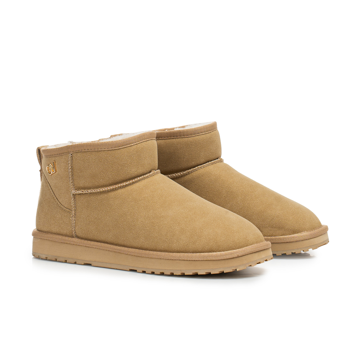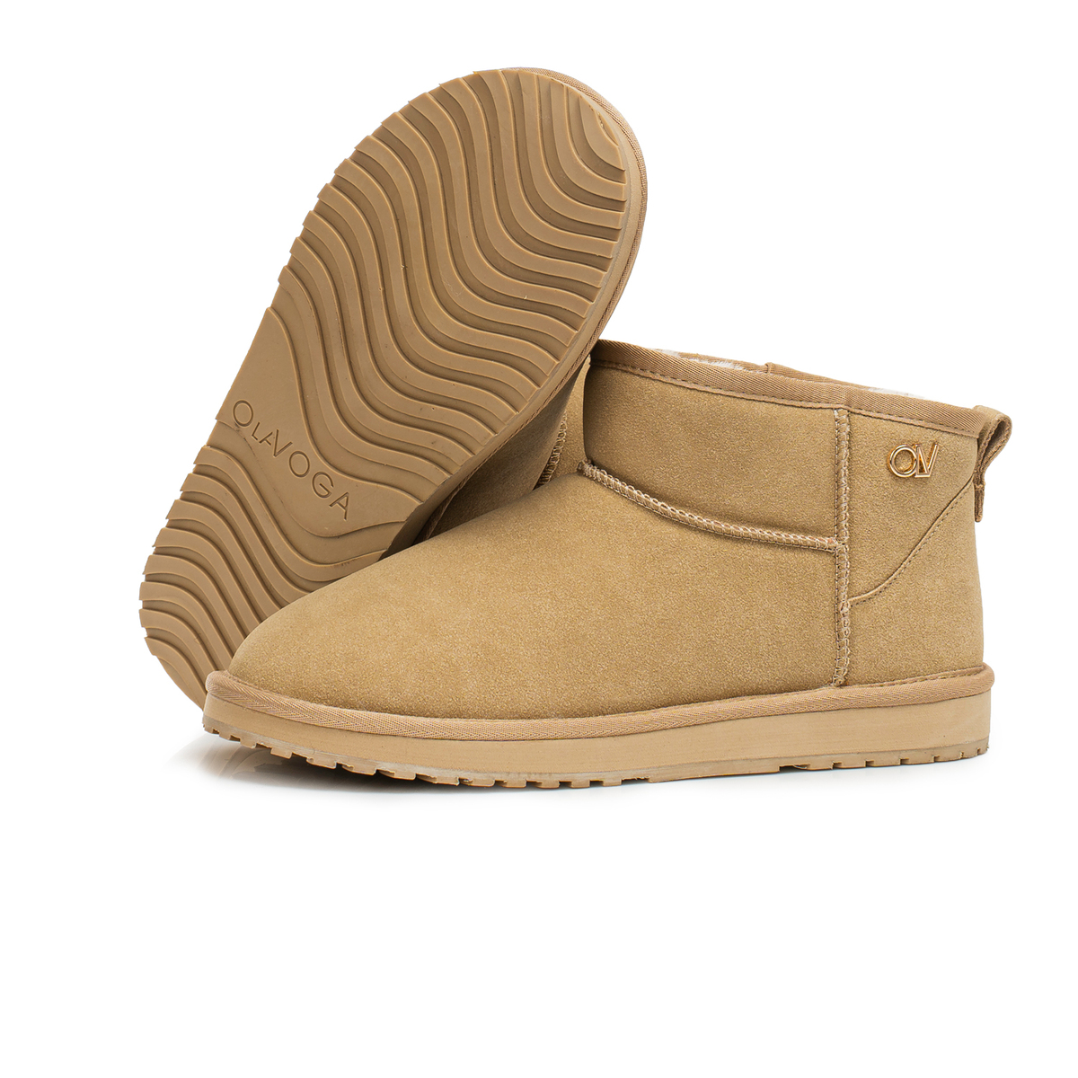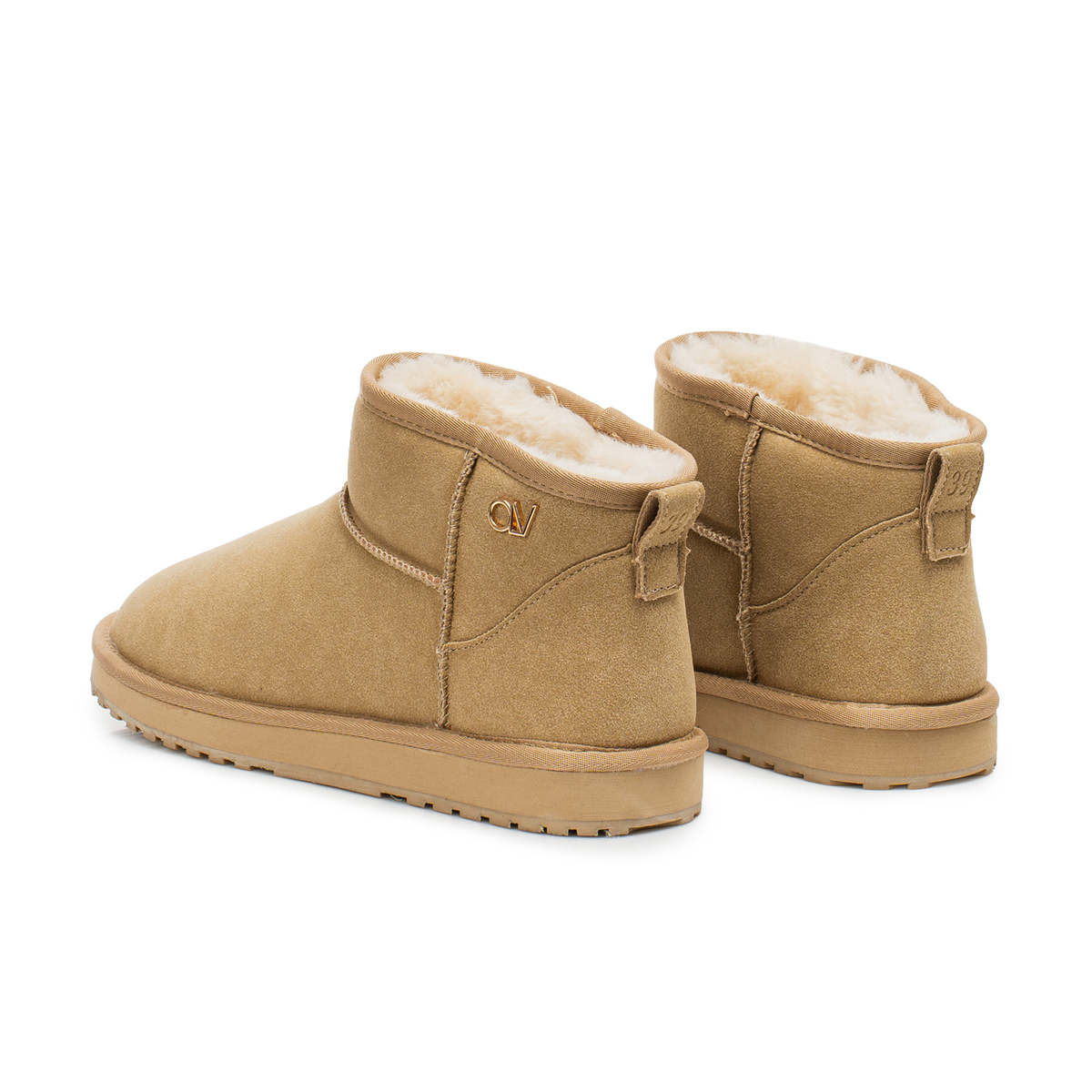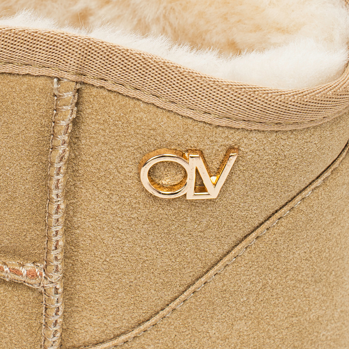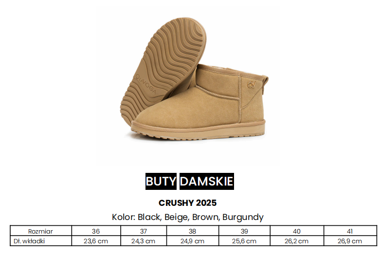 Klasyczne buty, typu śniegowce. Wykonane z miękkiego, matowego materiału o zamszowym wykończeniu, z wewnętrznym ociepleniem z puszystego futerka. Na boku złote logo marki OLV. Buty są lekkie, miękkie i niezwykle komfortowe w noszeniu.