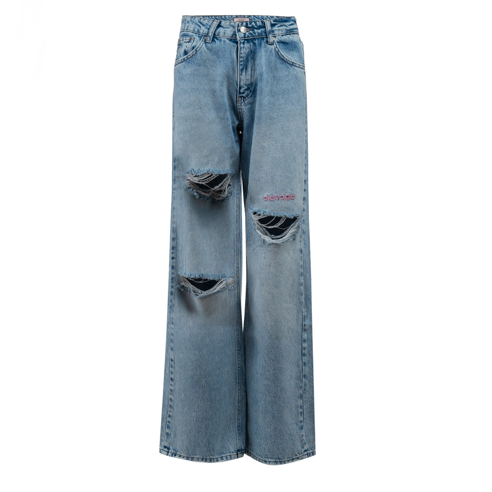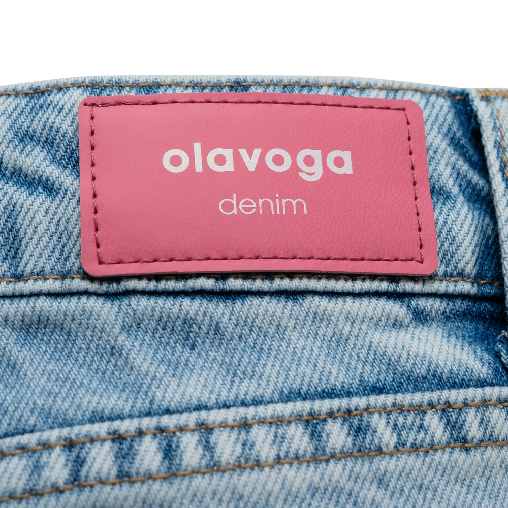Spodnie jeansowe wide leg jeans - lekko sprane wykończenie - model z klasycznym stanem - zapinany na logowany guzik i zamek - pięciokieszeniowa konstrukcja - efektowne przetarcia z postrzępionym wykończeniem typu distressed - subtelne różowe hafty OLAVOGA - z tyłu naszywka OLAVOGA denim.