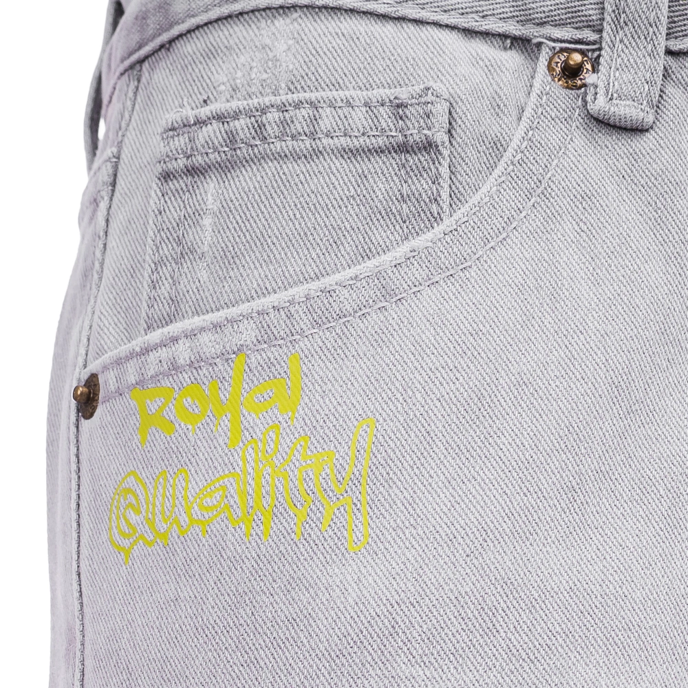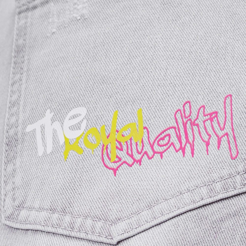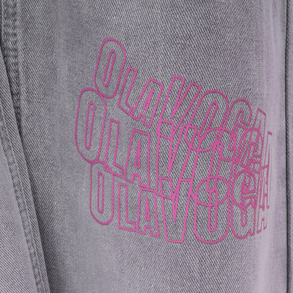 Casualowe jeansy o nowoczesnym, streetwearowym charakterze, wykonane z wysokiej jakości denimu. Prosty, lekko luźny krój. Na przodzie kontrastowy nadruk z logo marki OLAVOGA, uzupełniony różowym printem na nogawce. Tył zdobią efektowne przetarcia oraz nadruk „Royal Quality” na kieszeni. Surowo wykończone nogawki ze strzępieniem, metalowy guzik z logowaniem oraz klasyczne kieszenie.