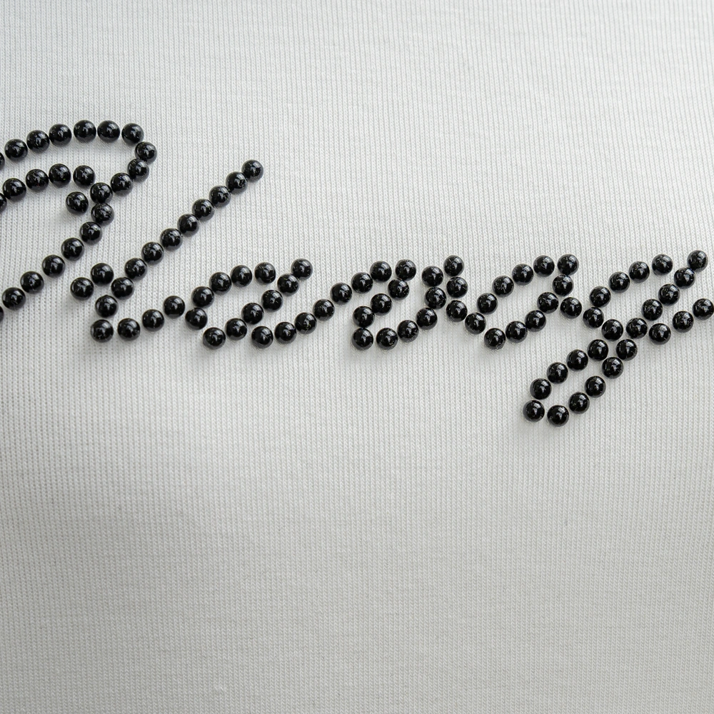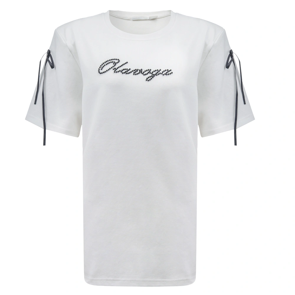 Fason oversize - przedłużona forma - wysokogatunkowa tkanina - okrągły dekolt wykończony ściągaczem - krótki luźny rękaw z kontrastowymi wiązaniami - poduszki wszyte na ramionach - na przodzie aplikacja z perełek w kontrastowym kolorze układająca się w logo OLAVOGA - gładka struktura materiału - proste wykończenie dołu.