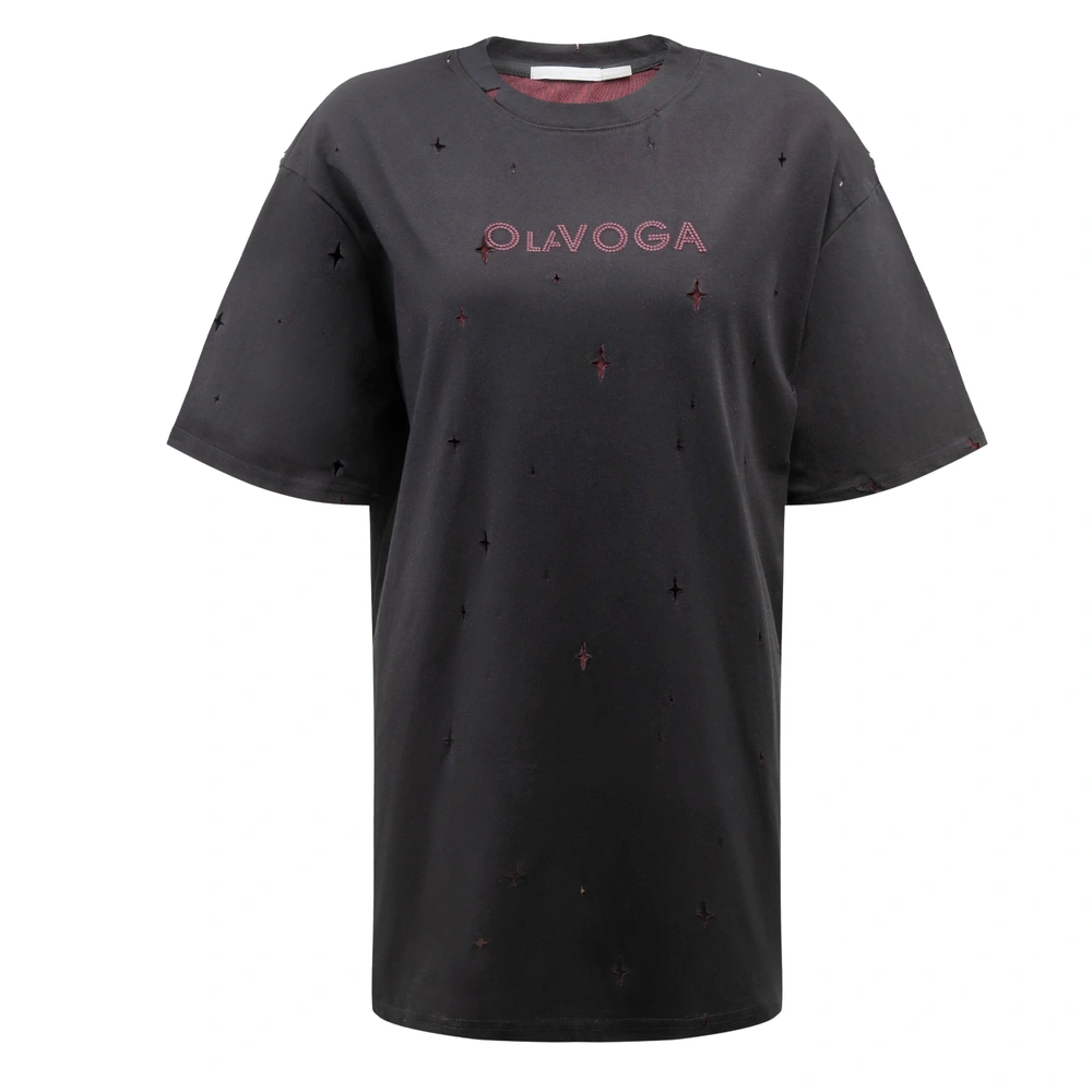 Fason regular fit - przedłużona forma - obniżona linia ramion - krótkie rękawy o swobodnym kroju - na całej powierzchni drobne perforacje w formie gwiazdek odsłaniające kontrastowy kolor spodniej warstwy - na przodzie drobne teksturowane haftowane logo.