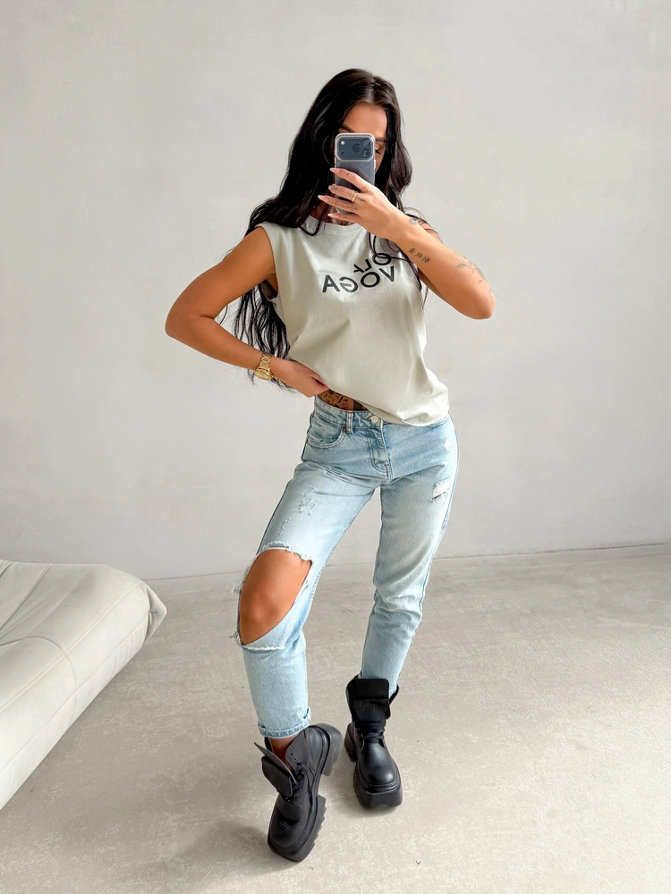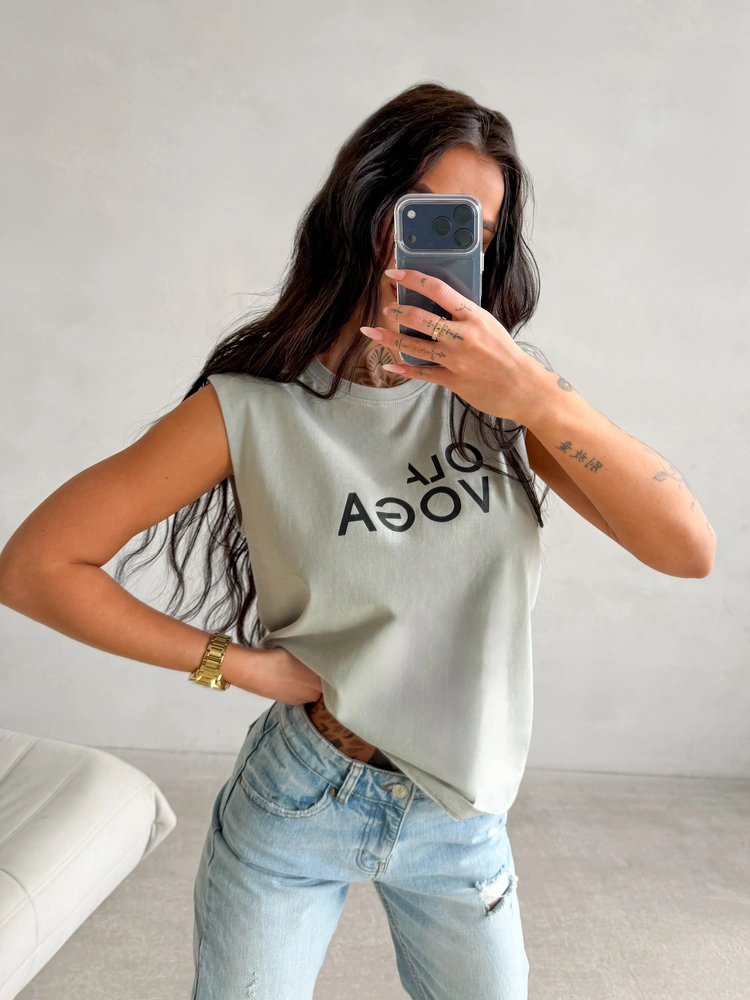 Luźny krój - wysokogatunkowa dzianina - model bez rękawów - wszyte poduszki na ramionach - okrągły dekolt - kontrastowy nadruk z logo na przodzie.